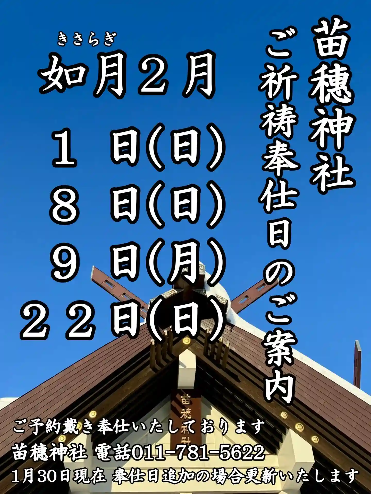苗穗神社より2月ご祈祷奉仕日のご案内です。