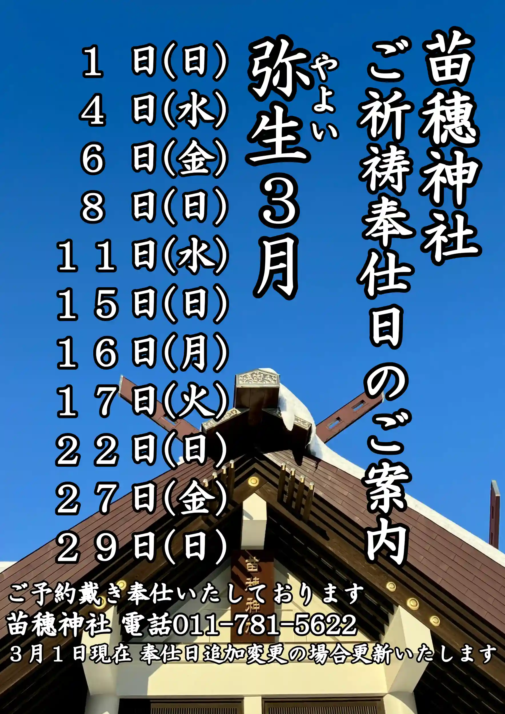 苗穗神社より弥生3月奉仕日のご案内です。