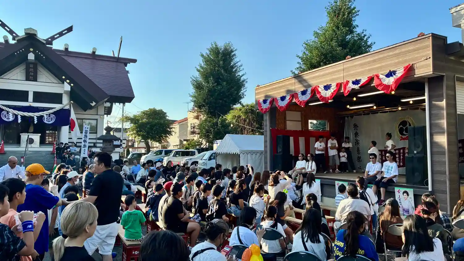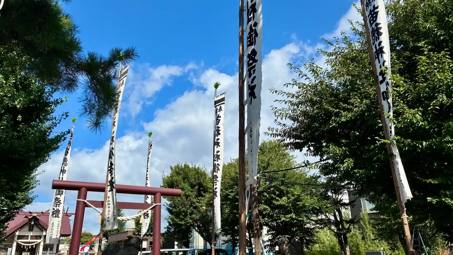 この日は例祭の神社巡り。神楽を見た札幌村神社にもほど近い苗穂神社にも大幟があが…
