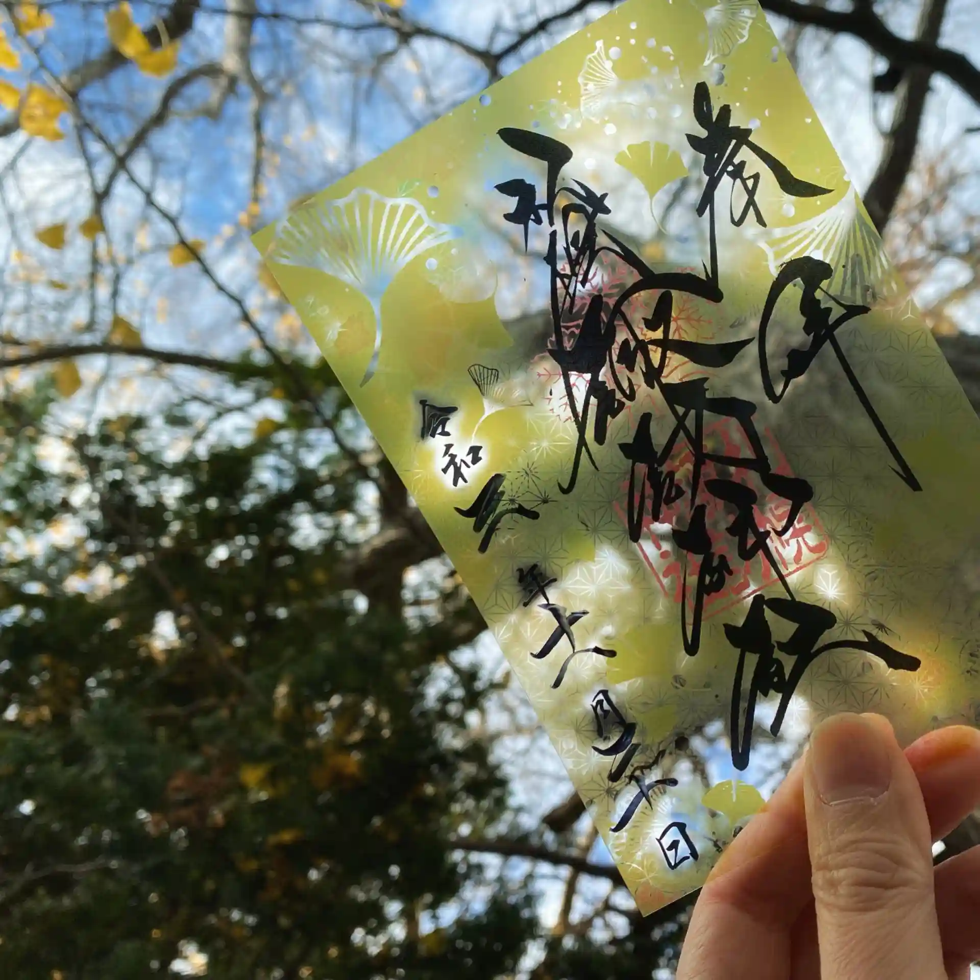 葉が無くなった銀杏の木にクリア御朱印をかざすと映えると思ったのですがそうでも無かったです😂