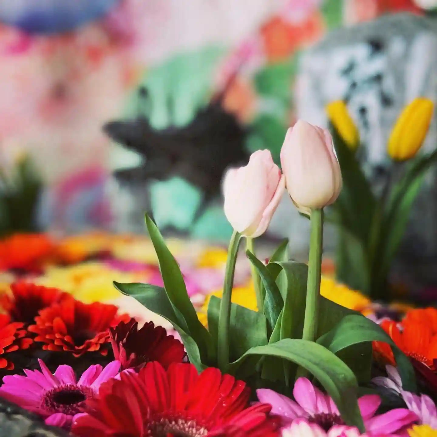 春の花手水としてガーベラとチューリップを使ってます😊