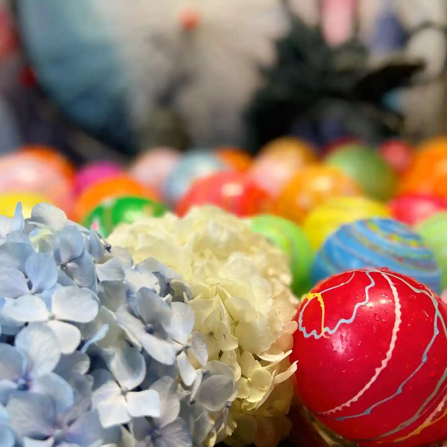 ヨーヨーの花手水は19日までの予定です🪀今朝はひまわりと紫陽花を追加しました😊⛩