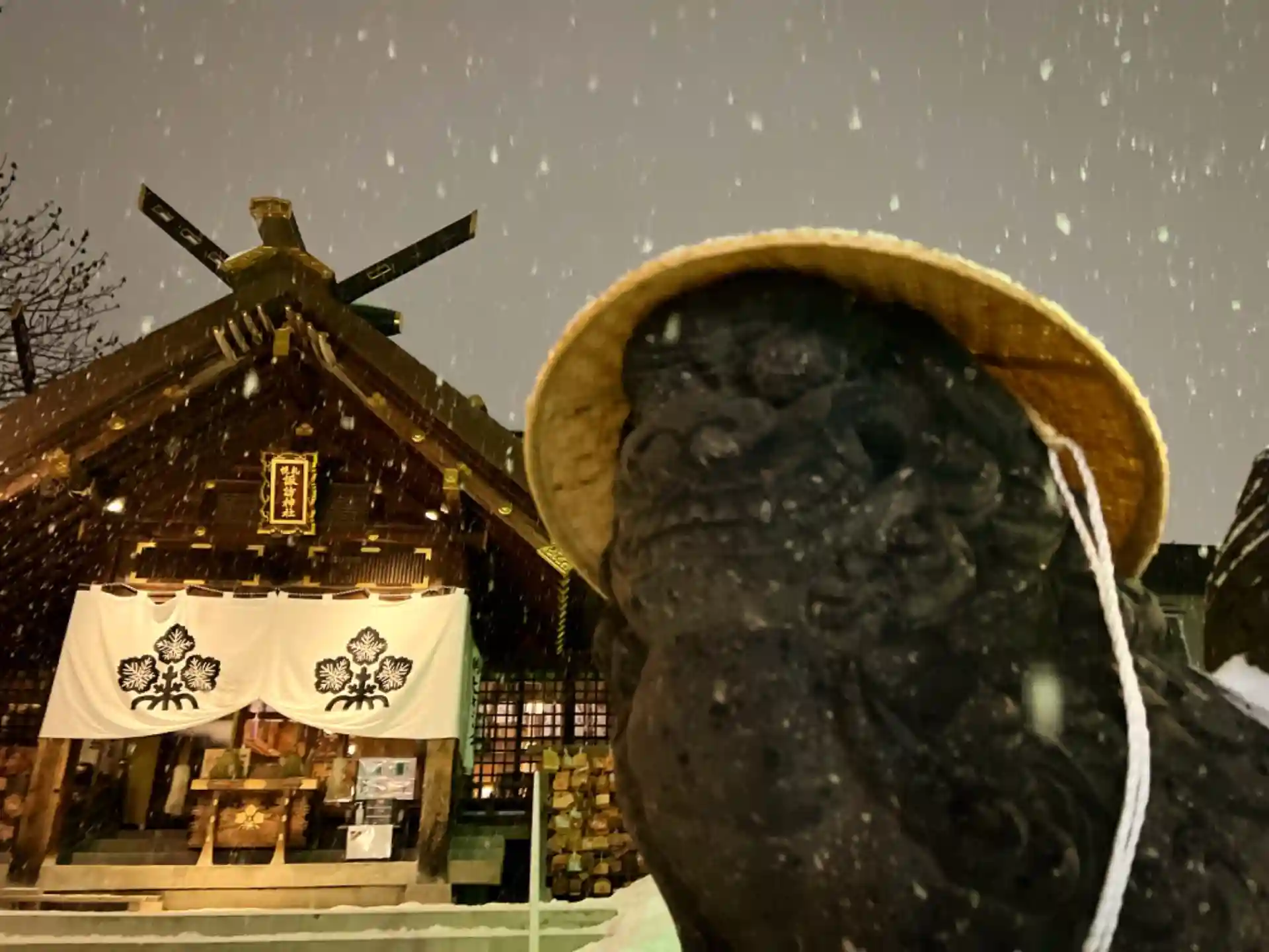 狛犬に笠をかぶせました⛩