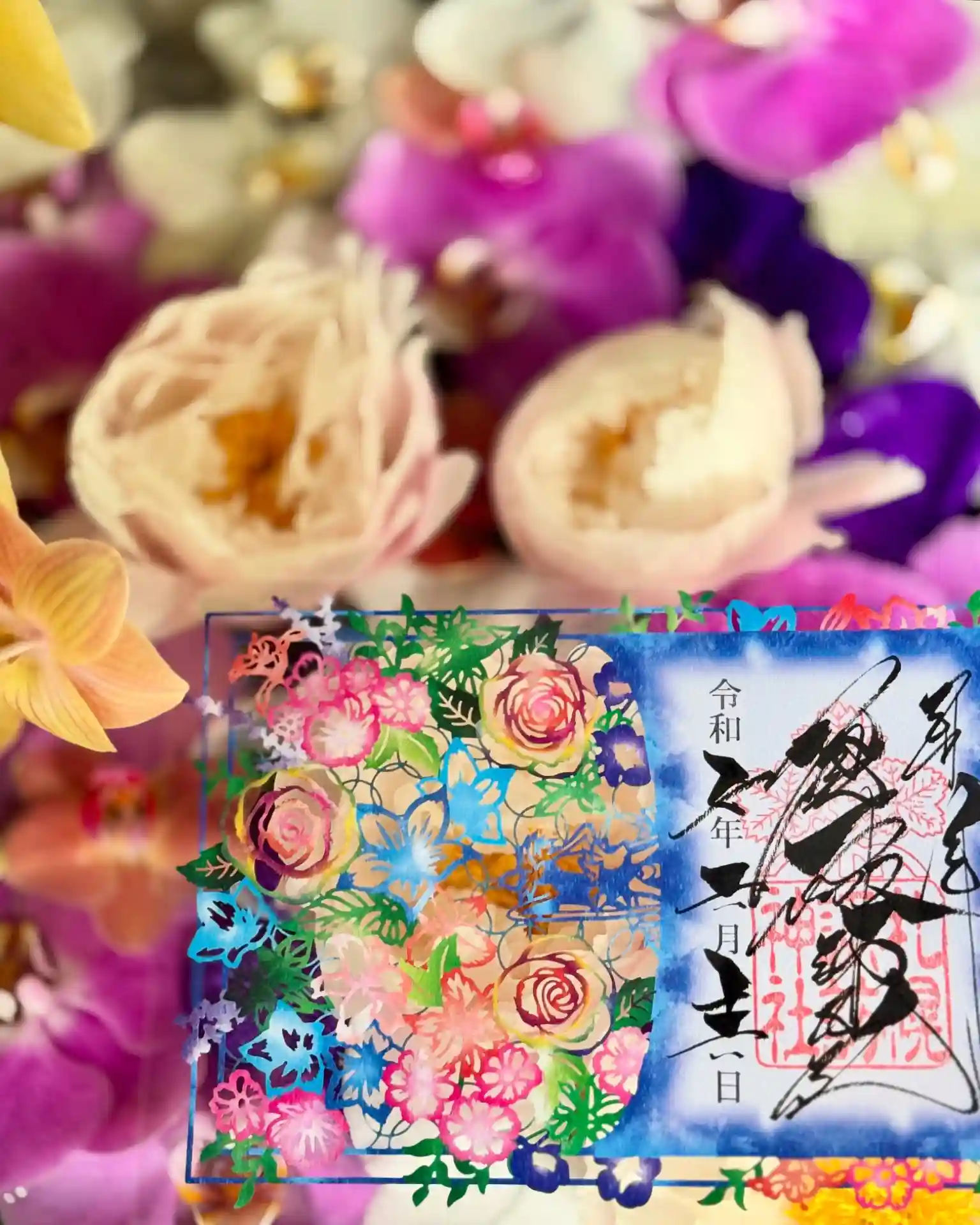 当社の花手水を切り絵で表現した御朱印です😊
