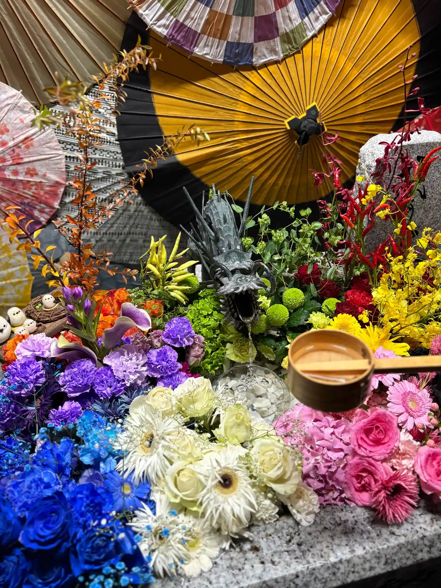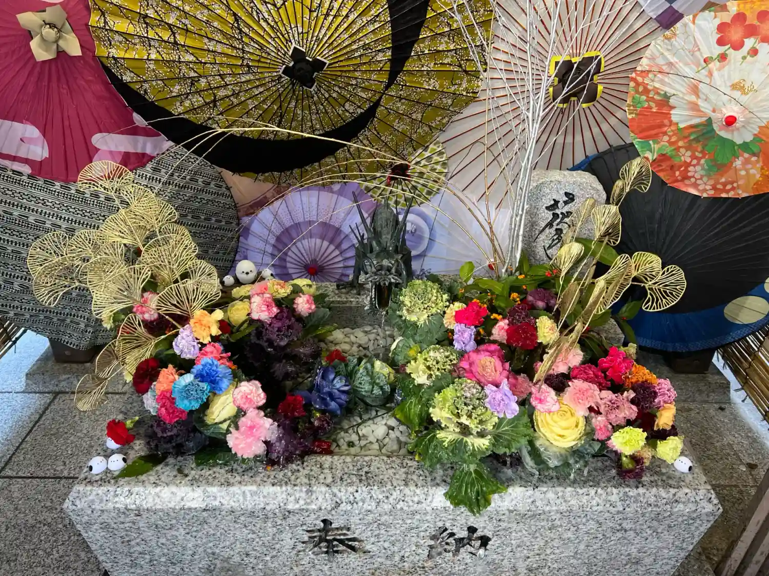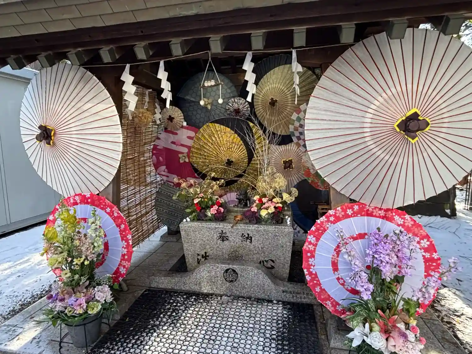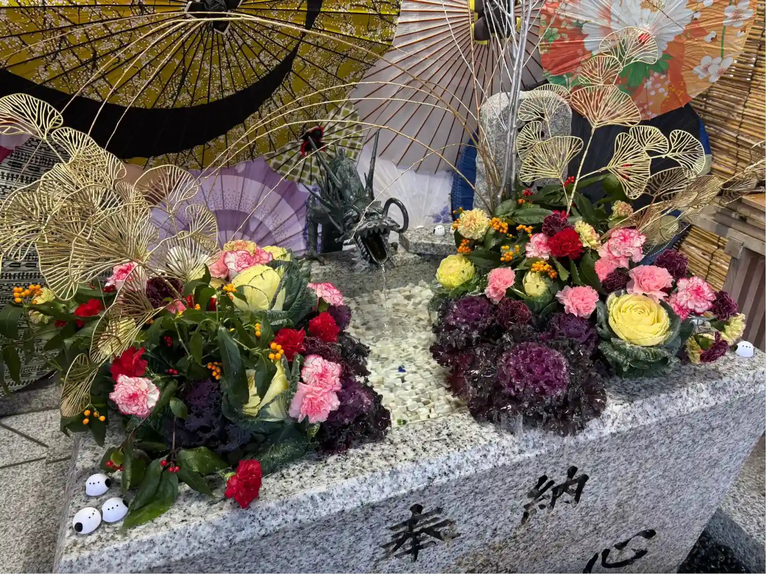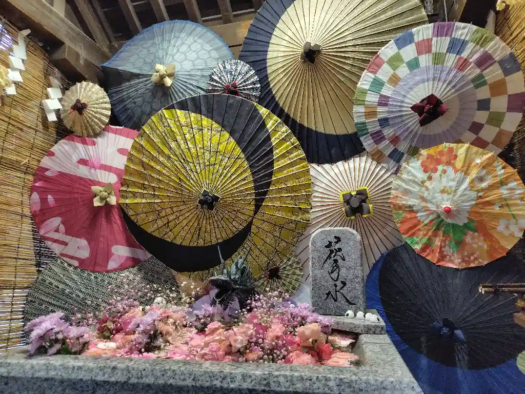花手水も華やかで、和傘との組み…
