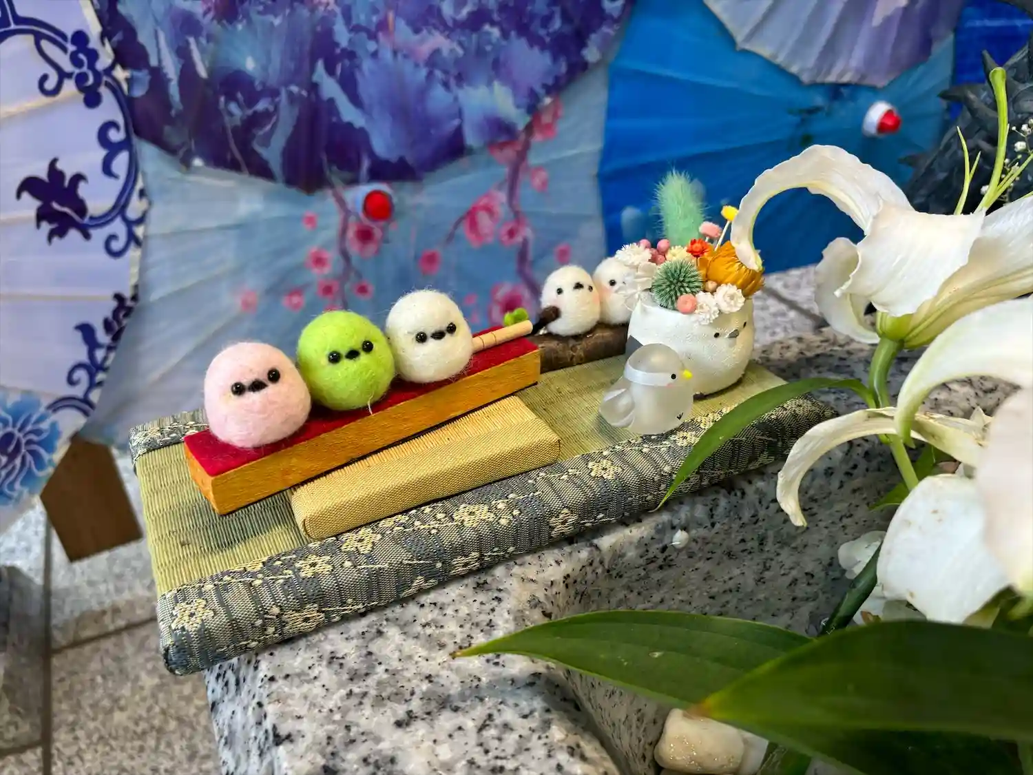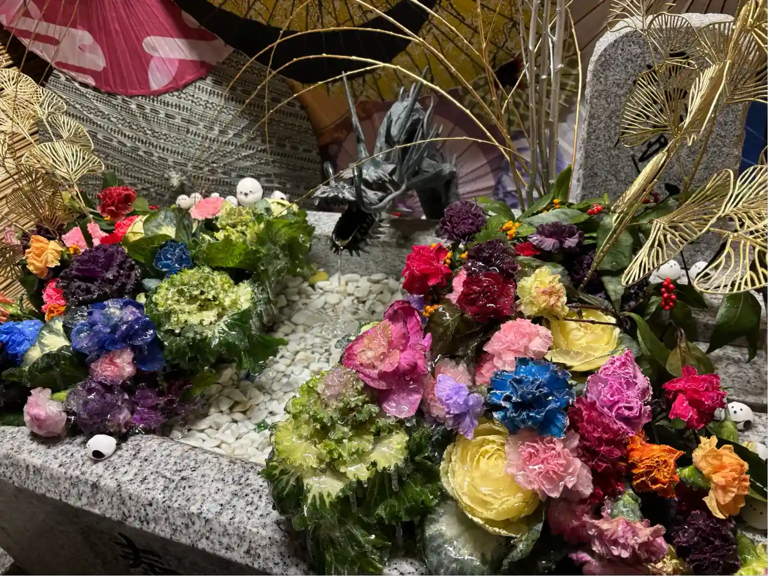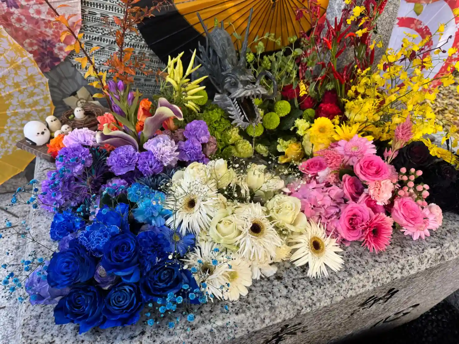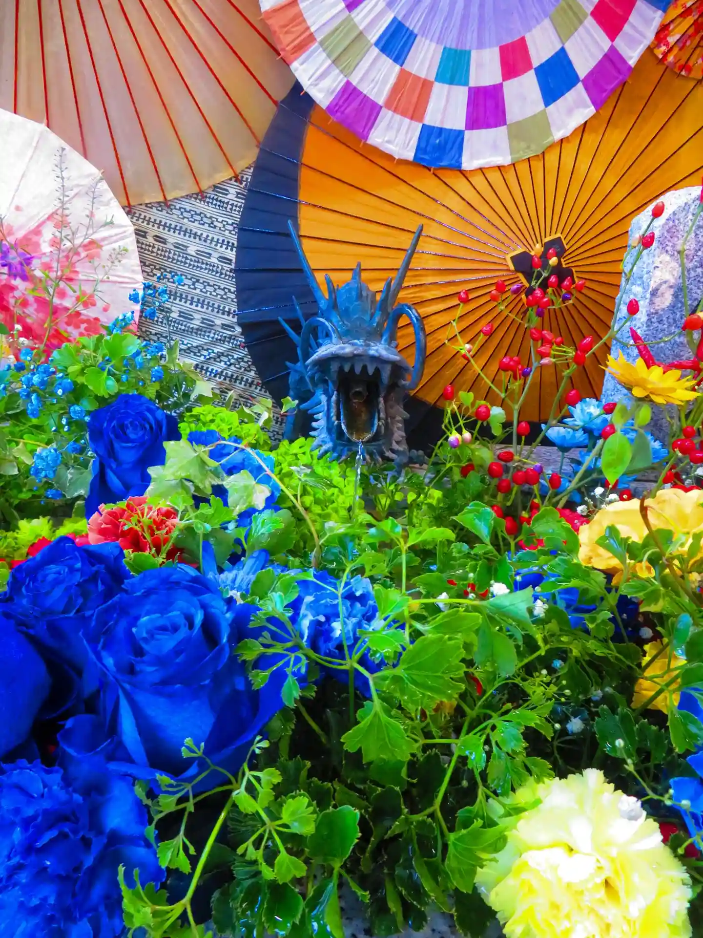 花手水も華やかで、和傘との組み…