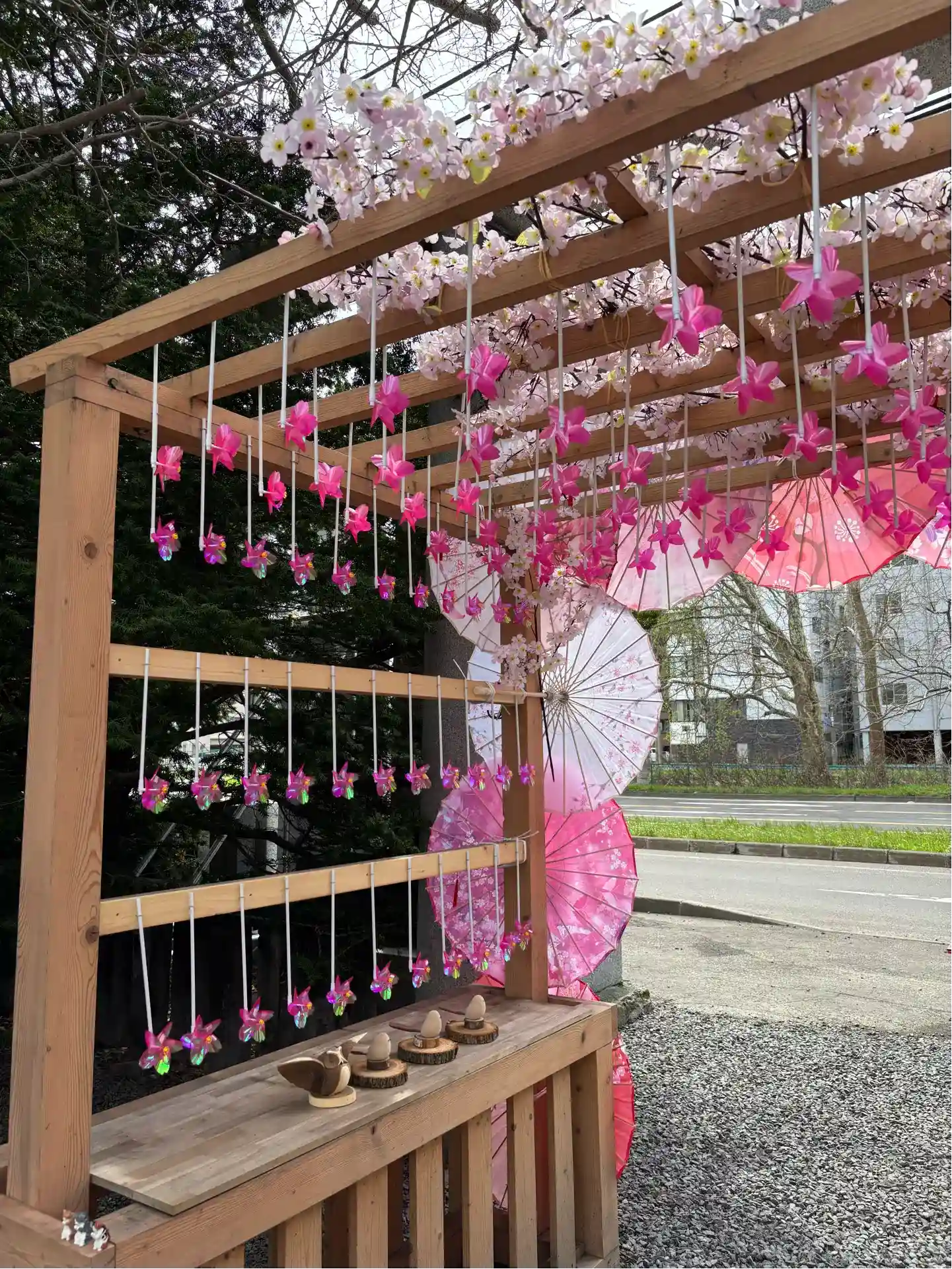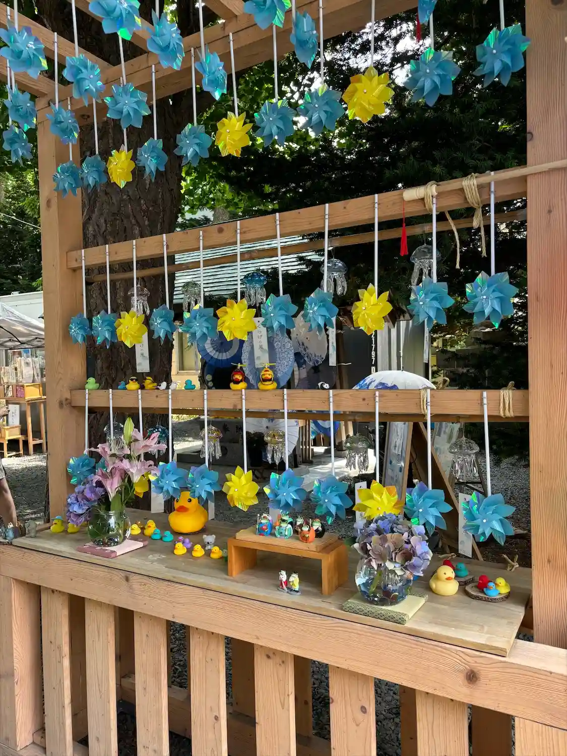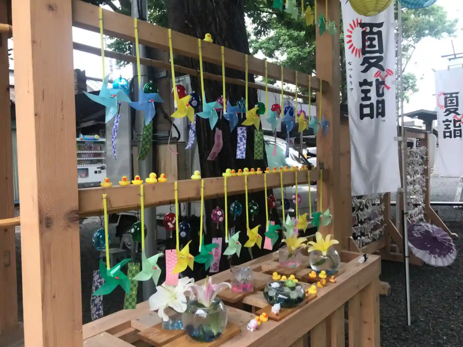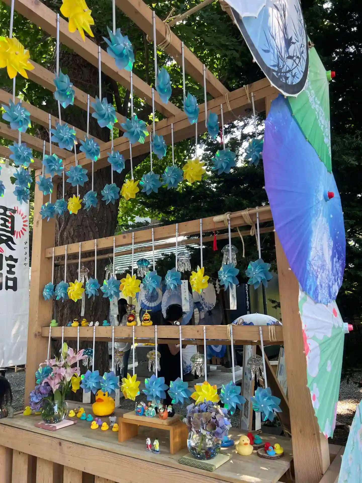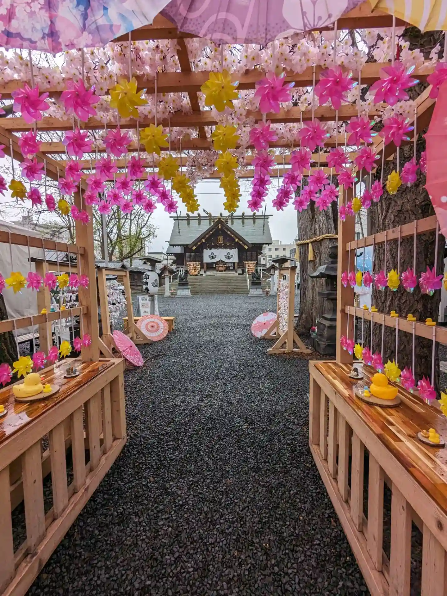 鳥居の風車棚にも和傘が設置されて華やか😊