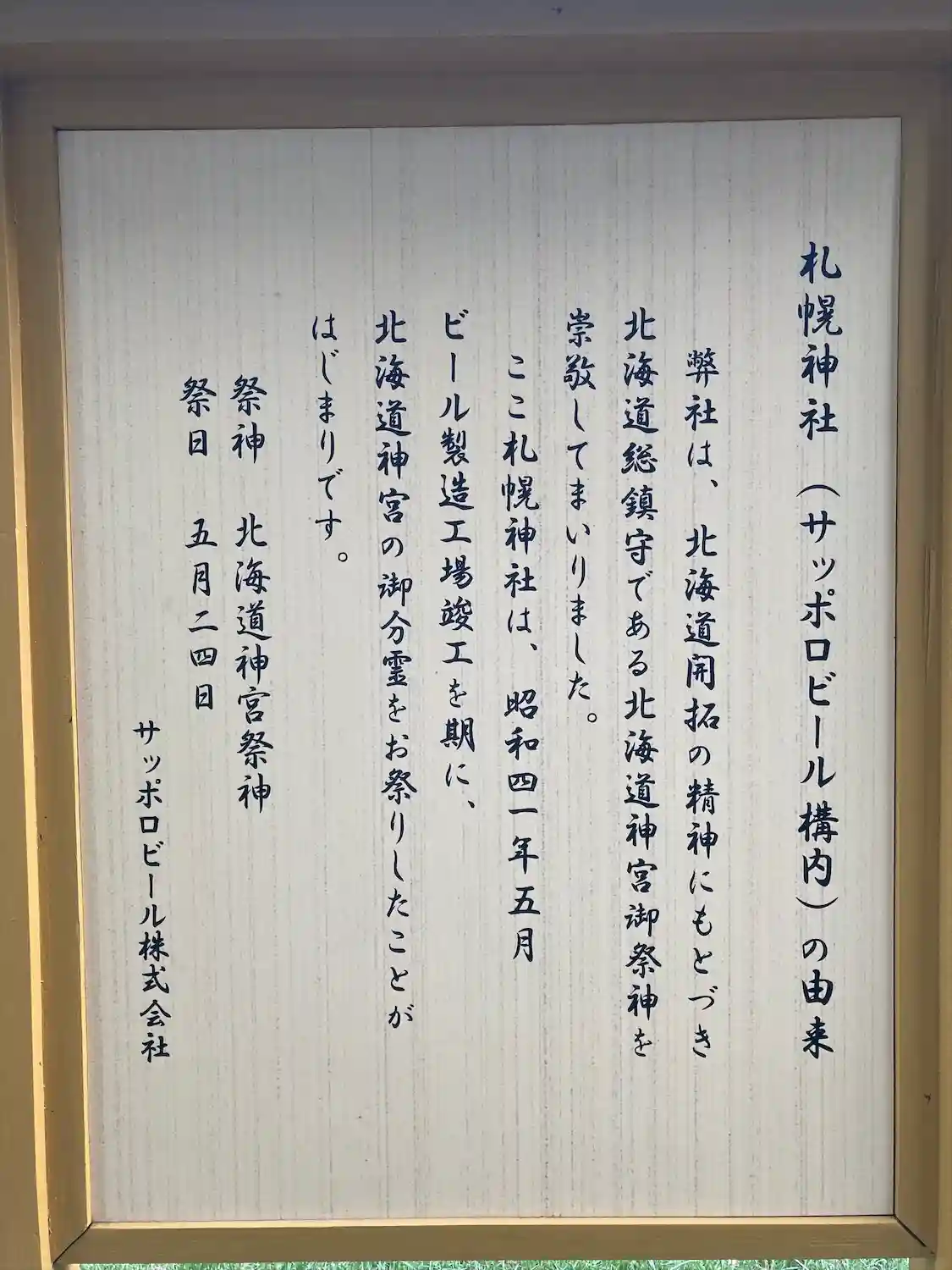 昭和41年ビール製造始めた際にできた神社で、構内神社同様に小さめな神社ですが、札幌発展のために貢献してきた神社です。