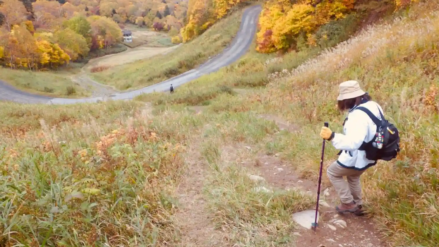 帰りはゲレンデを一気に下りました。脚にきますので、自信のない方は下に見えている舗装道路(テレビ山道)に迂回して安全に下りるのがお勧めです。