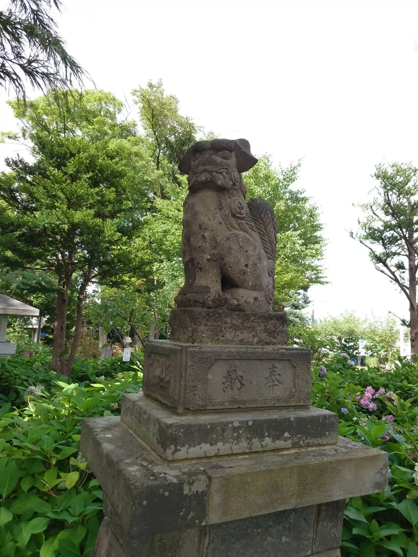 鳥居をくぐって、参道左側にある<狛犬>。年季が入っていて、個性的で愛嬌のある表情。