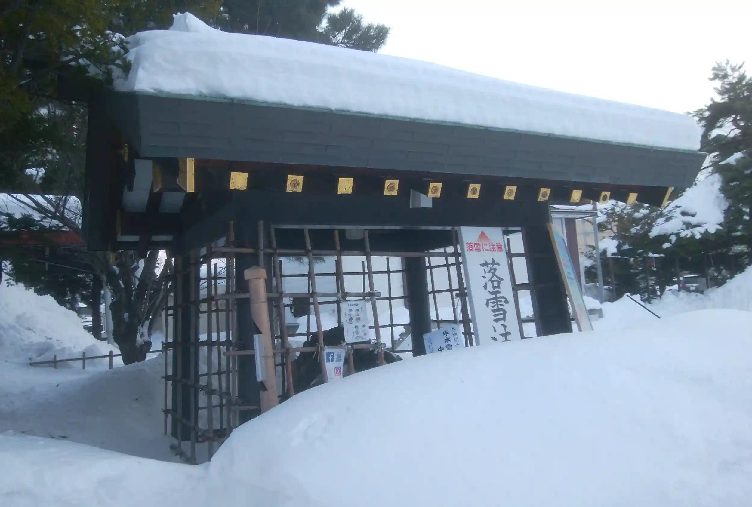 手水舎は落雪注意で近寄れません、、