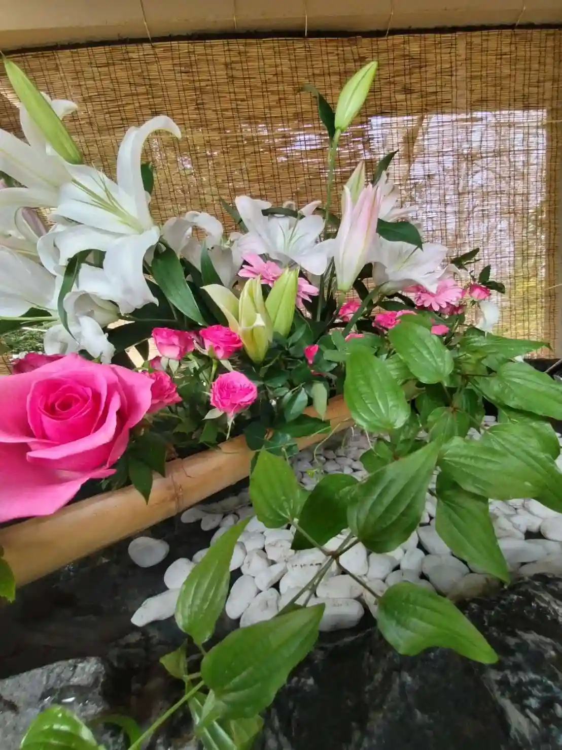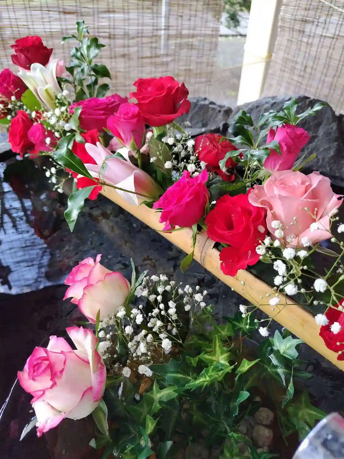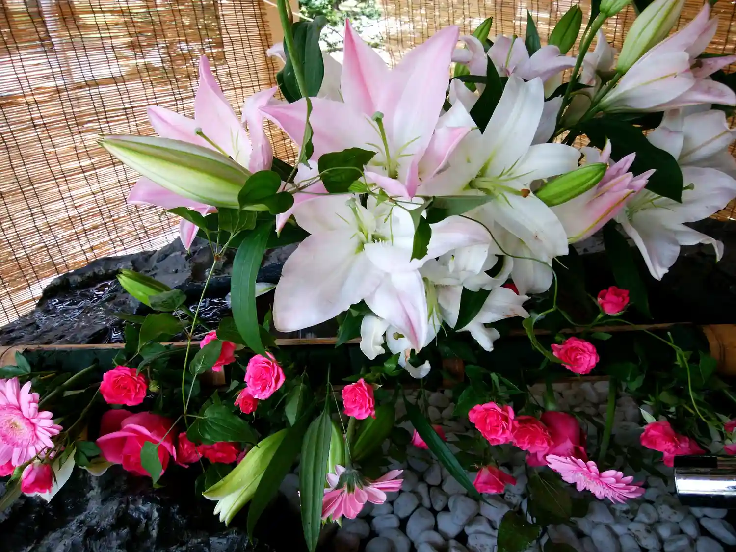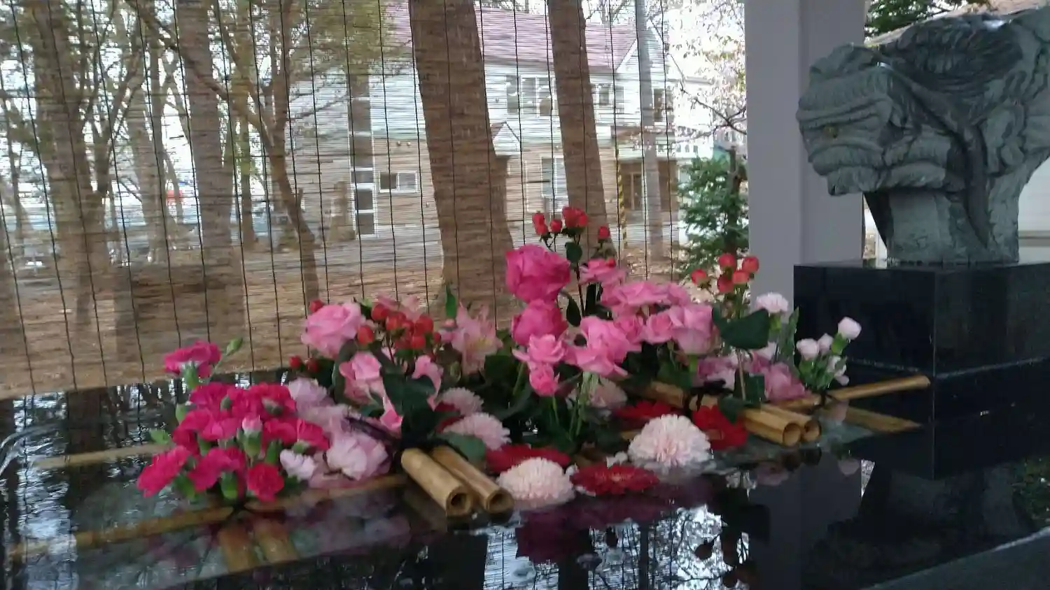 当社は今回バラを主とした赤系統の花で飾っております。