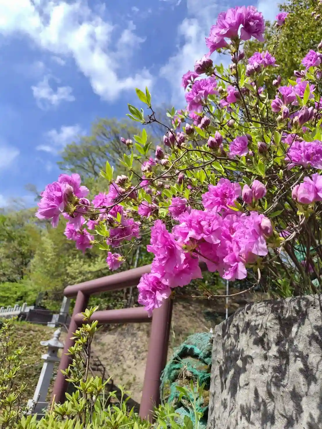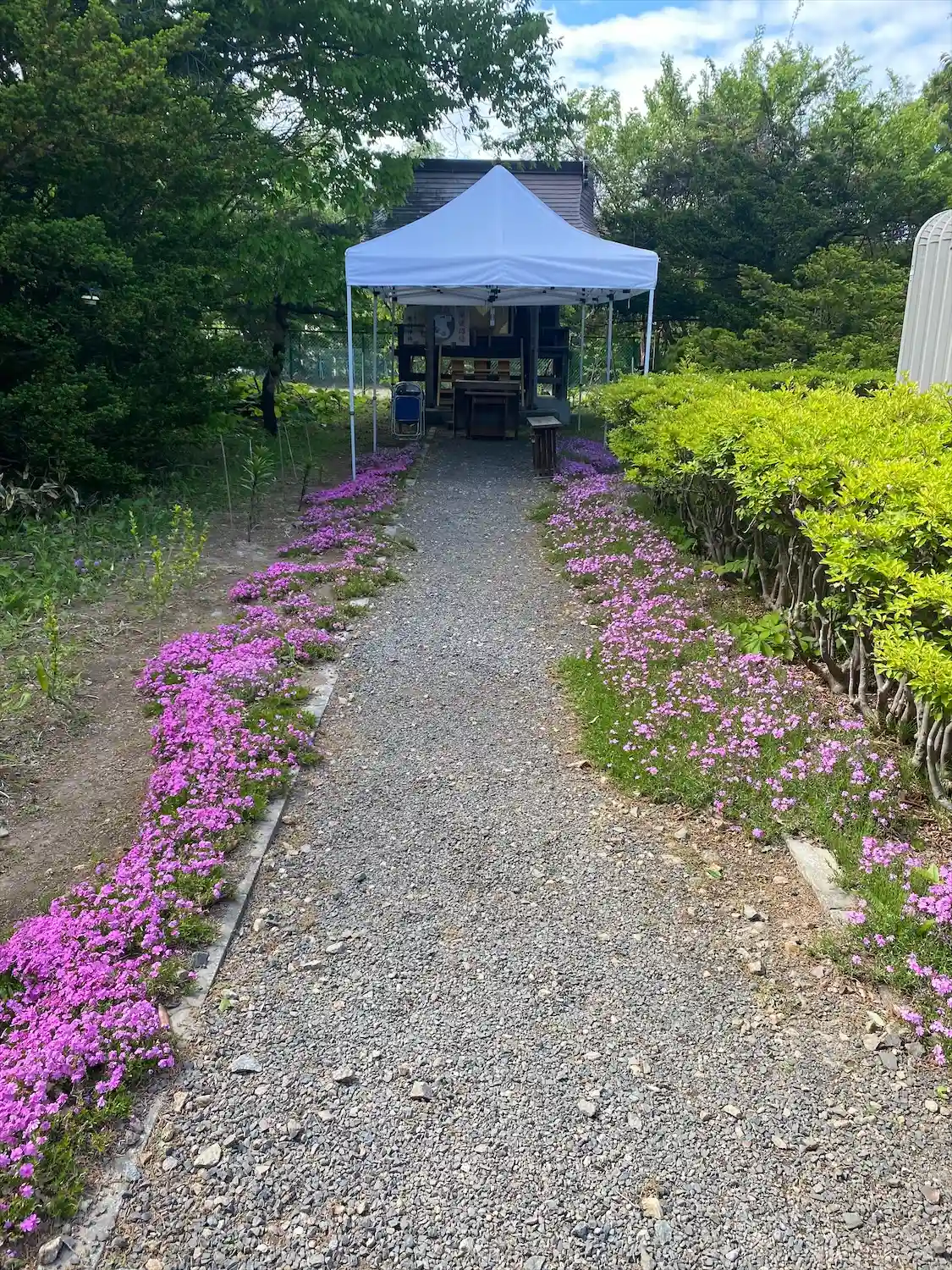 社殿裏からでも芝桜と八重桜を楽しむことができます。