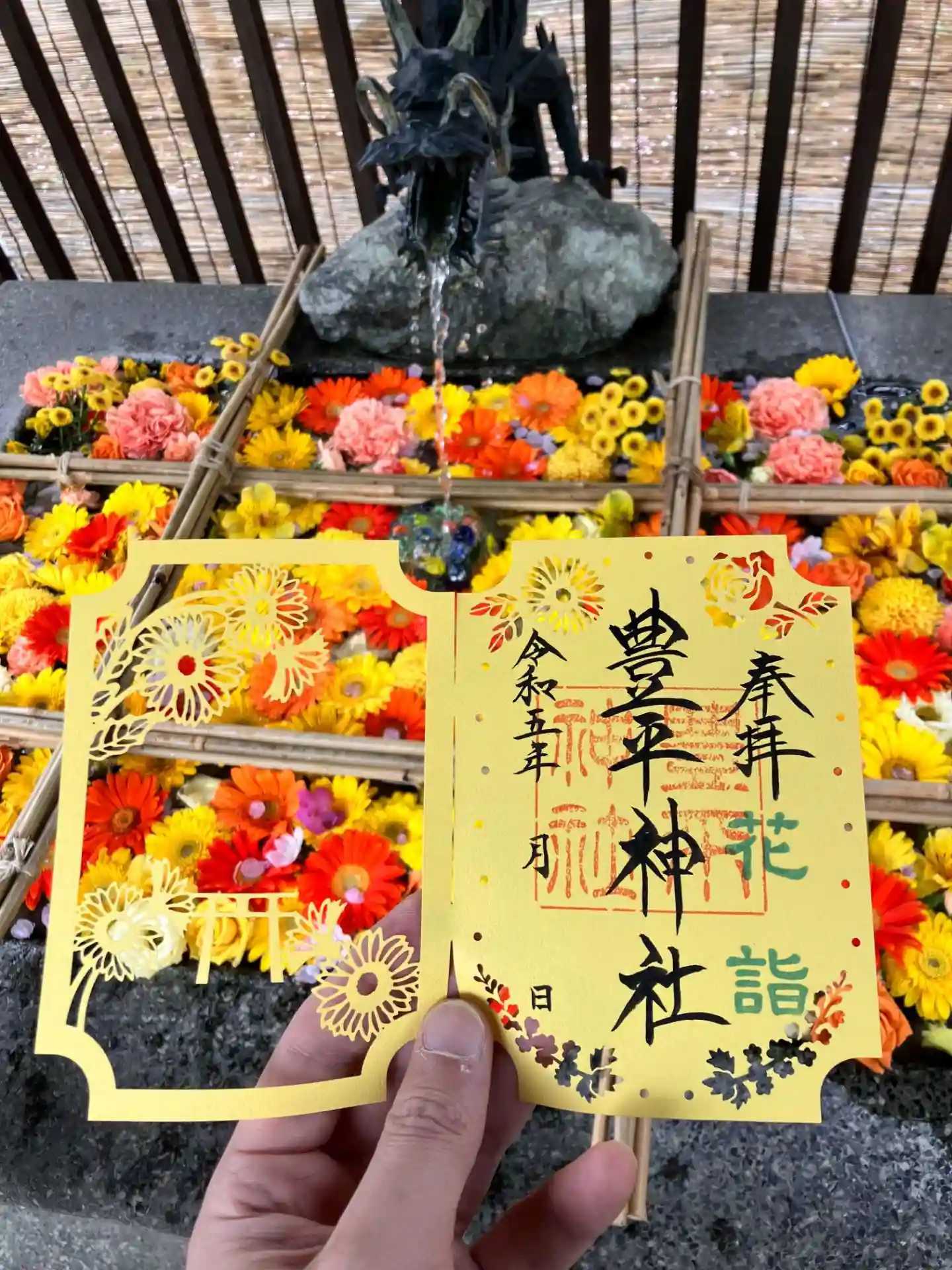 鳥居で幟と提灯にお出迎えされ、境内では豪華に飾られた花手水を楽しませていた…