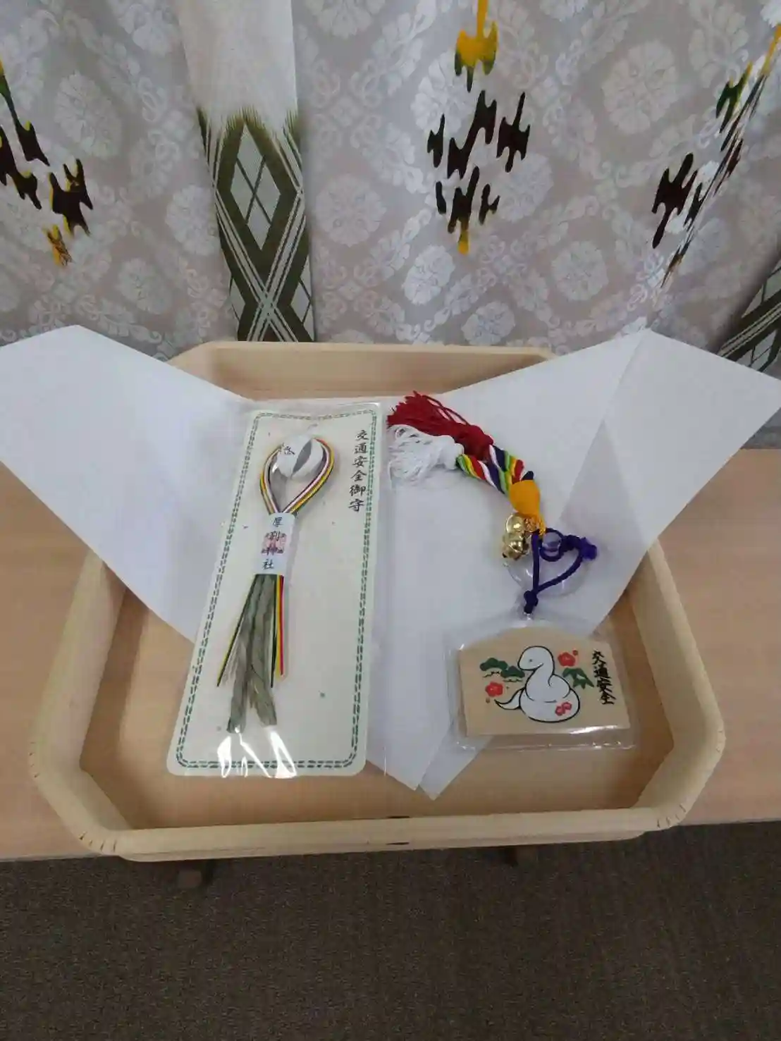 新しい車の為に同行の友人からの贈り物。クッションお守り、ふわふわしてます。新しい車になっても宜しくね…🤣と云うことらしい(笑)