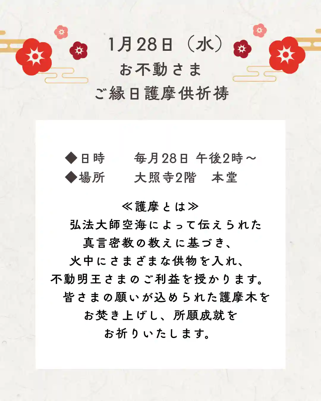 🟡当日、護摩札・祈願をお申し込みの方は13:30までに一階受付へお越しくださいませ。