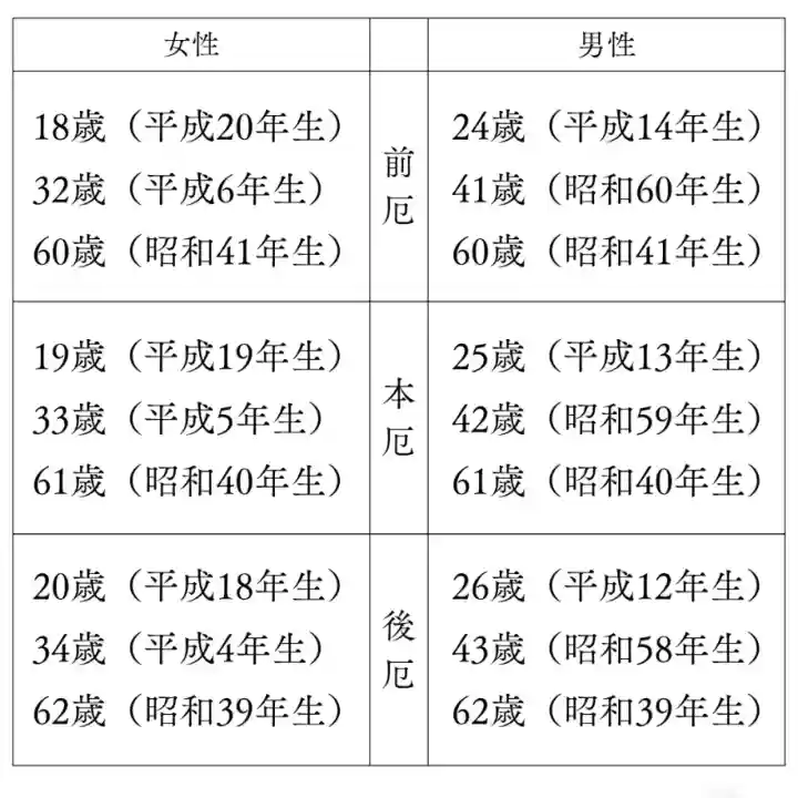 ◎令和7年 厄年早見表