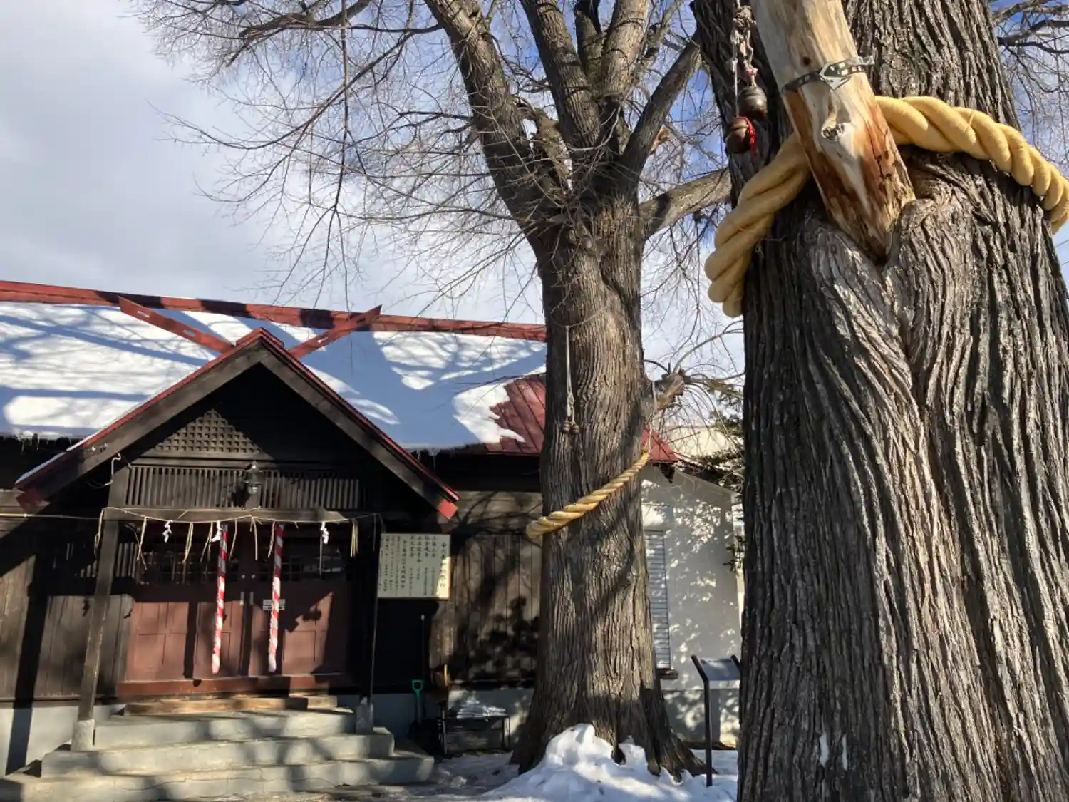 普段御神木には手を触れませんが、ここは別。私は手前の木と相性が良いみたいです。周りは駐禁なので車をとめるのが心苦しいのですが、お正月は路肩がしっかりと除雪されていて、参詣者は目溢ししてもらえそう。車に乗ろうとしたら、道路を挟んだ向かいに鳩が降り立ったので、早く良くなる印と受け止めました。