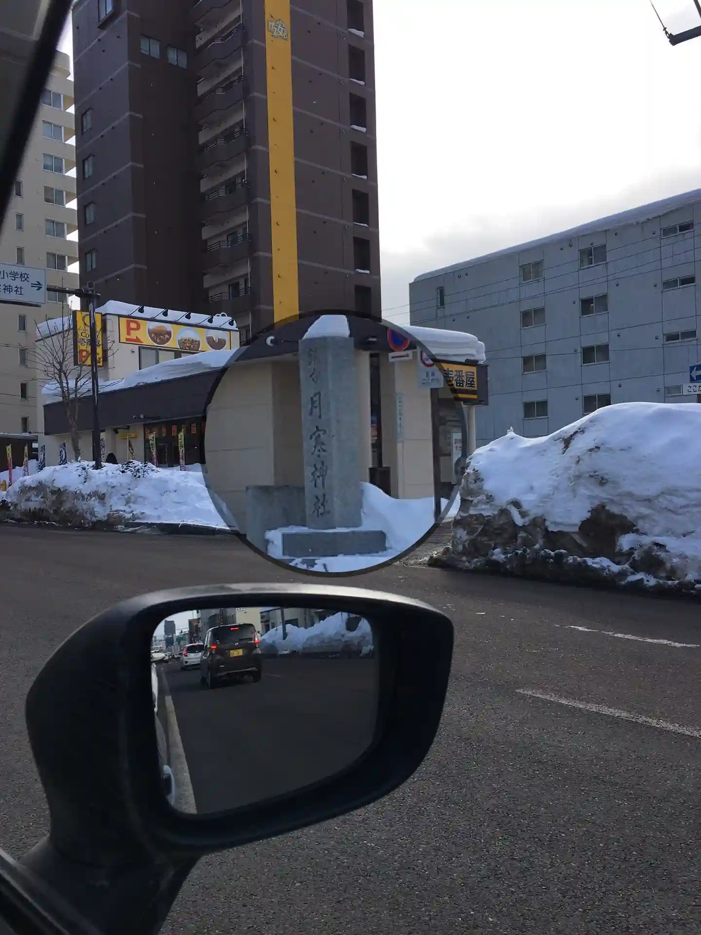 社号標のある角はカレー屋さん。曲がった先で、神社の手前にダンプが並んでいるのが見え、排雪作業に当たってしまった様子。これは行きつけないパターンかに思えましたが、鳥居の真正面で止められ(正中は避けてとまりましたが)、神様に品定めされているような気がして身がすくむような思いはしたものの、すぐに駐車場に入ってお詣りすることができました。