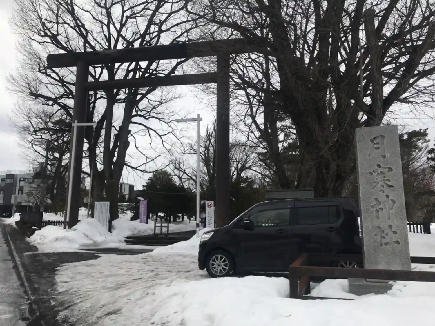 社号標のある角はカレー屋さん。曲がった先で、神社の手前にダンプが並んでいるのが見え、排雪作業に当たってしまった様子。これは行きつけないパターンかに思えましたが、鳥居の真正面で止められ(正中は避けてとまりましたが)、神様に品定めされているような気がして身がすくむような思いはしたものの、すぐに駐車場に入ってお詣りすることができました。