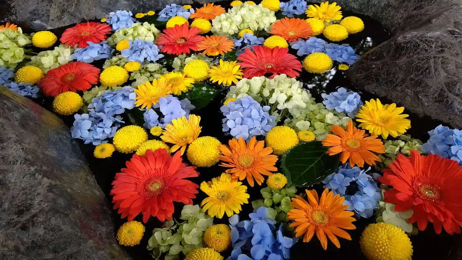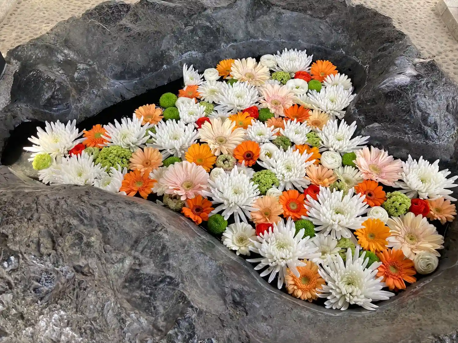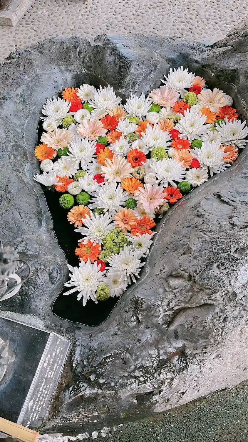 ハート型の手水鉢がすてきな花手水💐