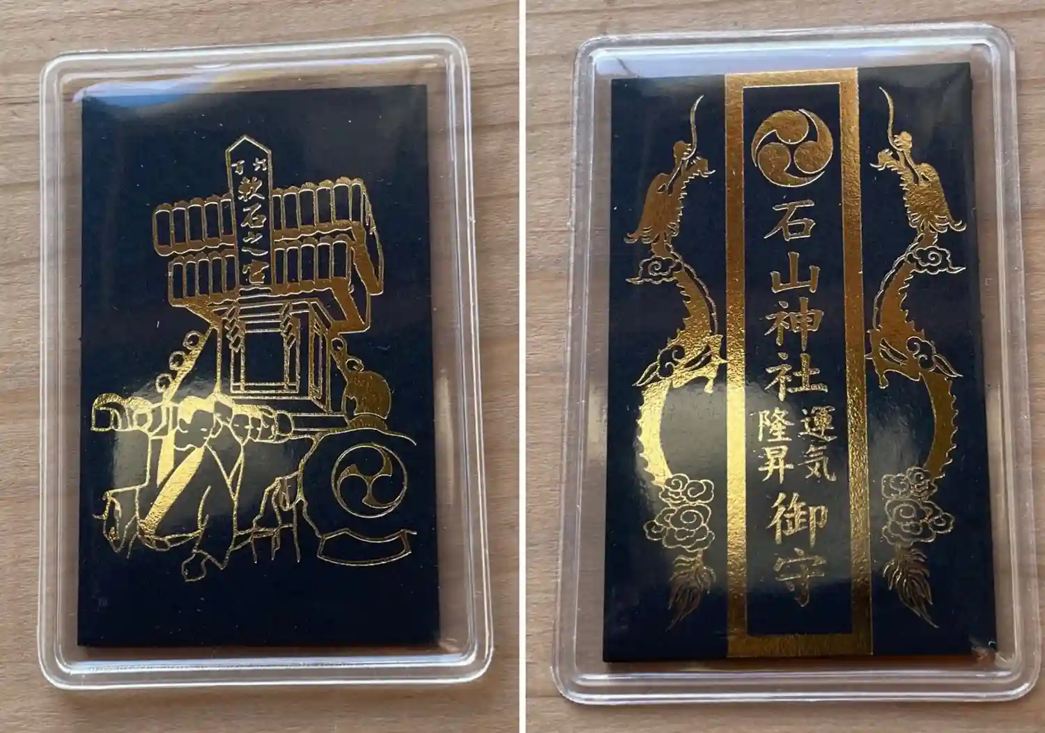 表の龍に惹かれて拝受したお守りでしたが、帰宅してひっくり返してみると、裏は御神輿でしょうか、「軟石之宮」という所がいかにも石切の里を標榜する石山らしいですね。