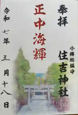 真ん中に住吉神社の文字と印が入り、その右に小樽総鎮守と添えられた御朱印です。紙に並び立つ鳥居と波の模様が描かれ、真ん中に住吉神社の文字と印が入り、その右に小樽総鎮守と添えられた御朱印もいただけます。 | |||