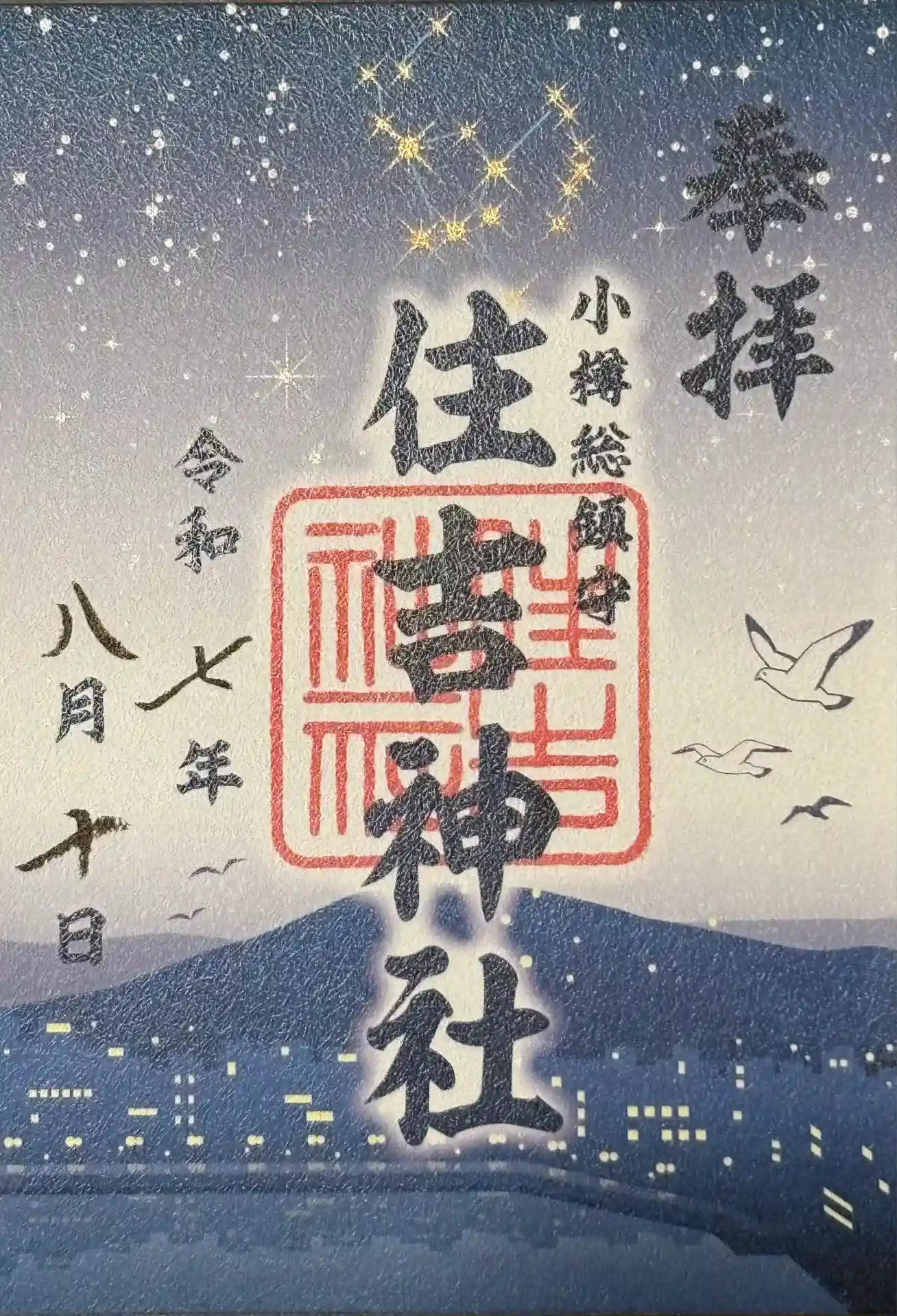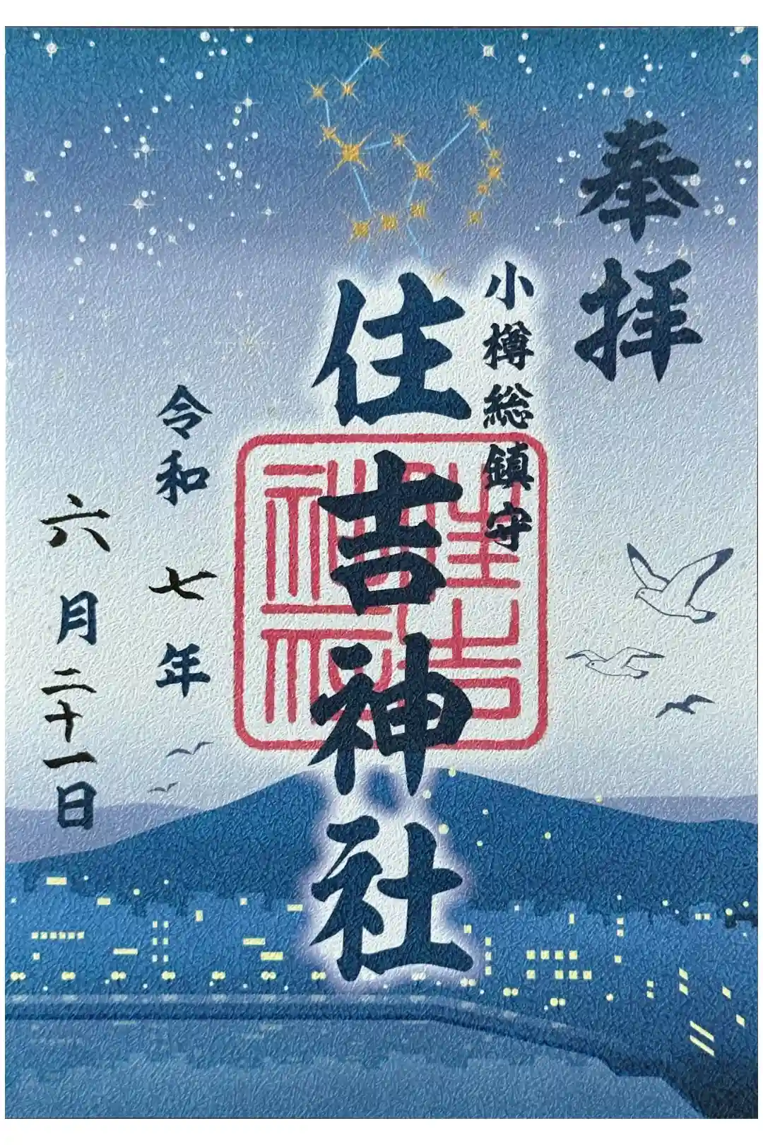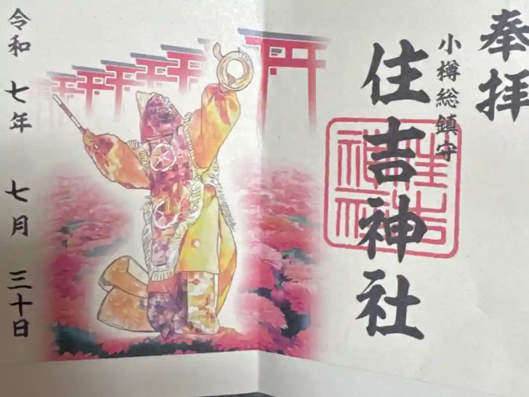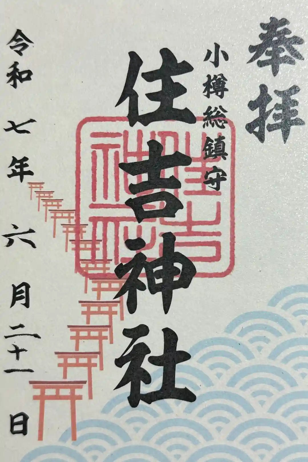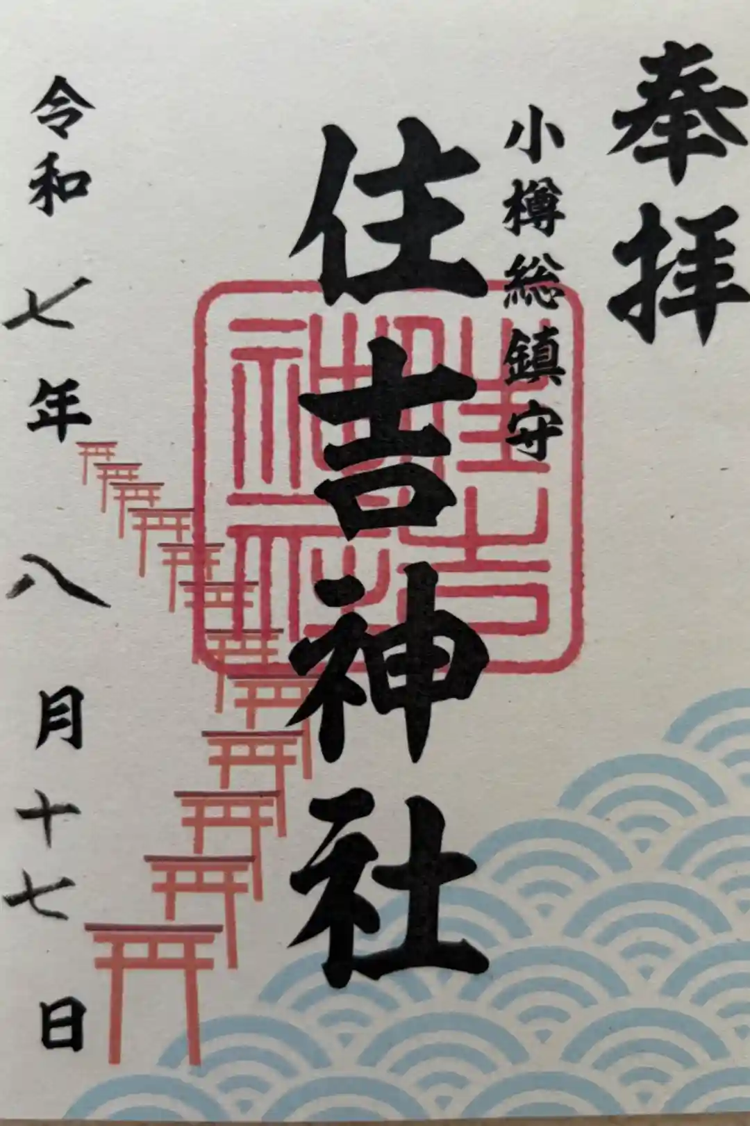 真ん中に住吉神社の文字と印が入り、その右に小樽総鎮守と添えられた御朱印です。紙に並び立つ鳥居と波の模様が描かれ、真ん中に住吉神社の文字と印が入り、その右に小樽総鎮守と添えられた御朱印もいただけます。 | |||
