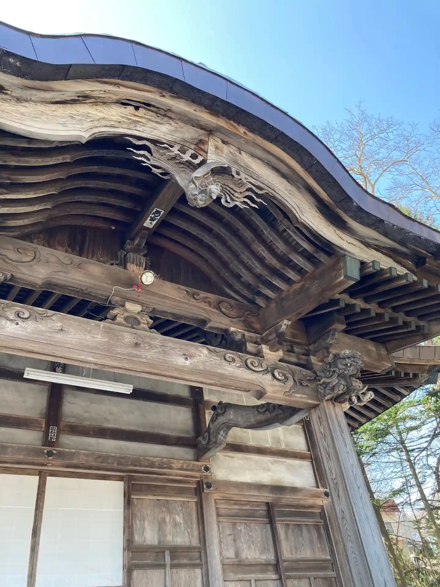 参道は雪が残り、傾斜地に鎮座しているため、細心の注意をして拝殿に向かいました。社殿は風雪によってか…