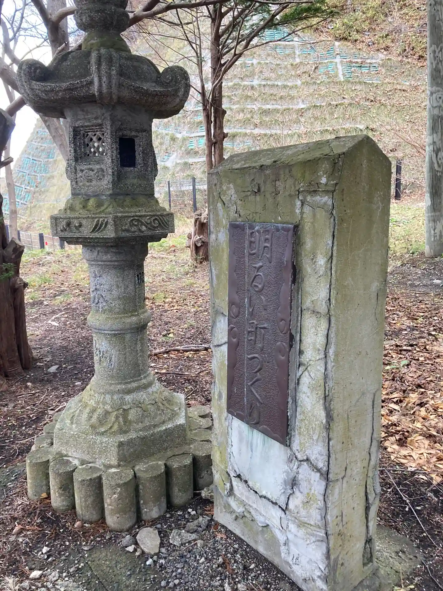 両脇に「交通安全」と「明るい町づくり」という石碑。