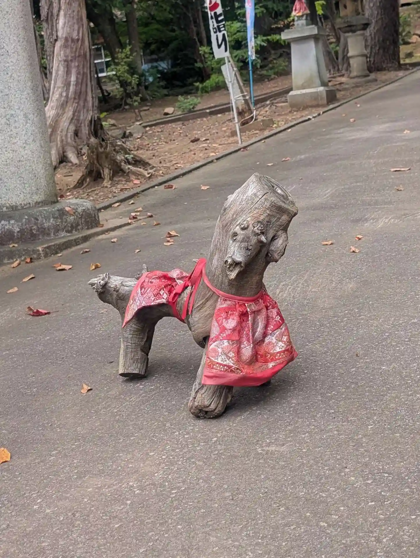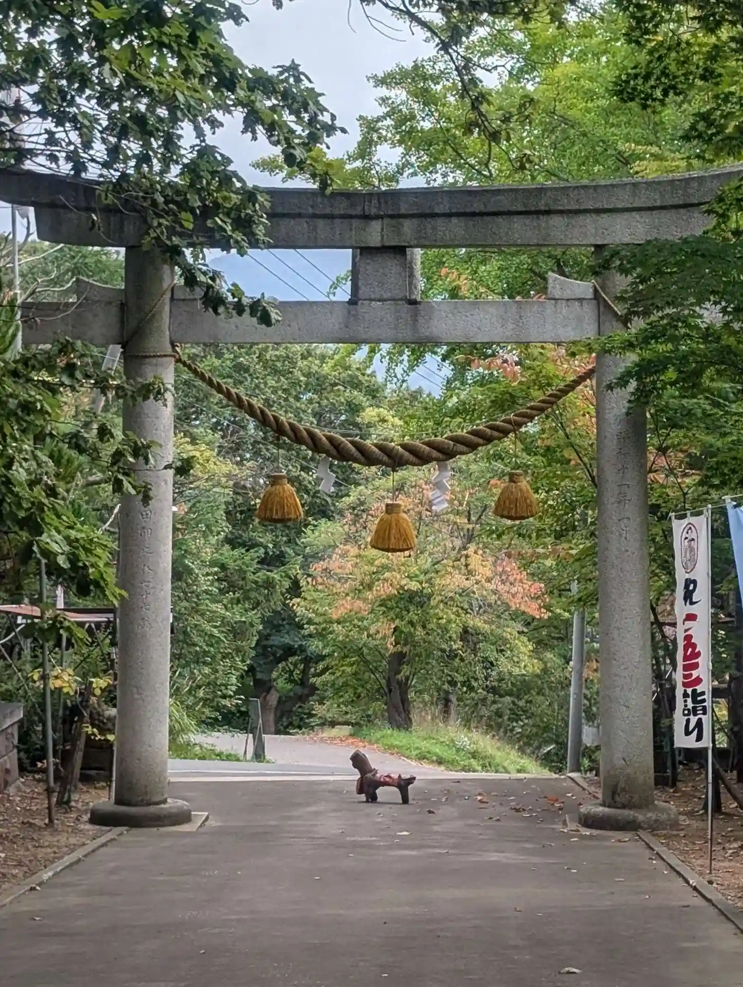 立派なしめ縄が張ってある鳥居の下の木の狛犬さんやおめかしした狛狐さん、他にも立派な狛犬さん、古い狛犬さん、小さな狛狐さんなどがみられます。