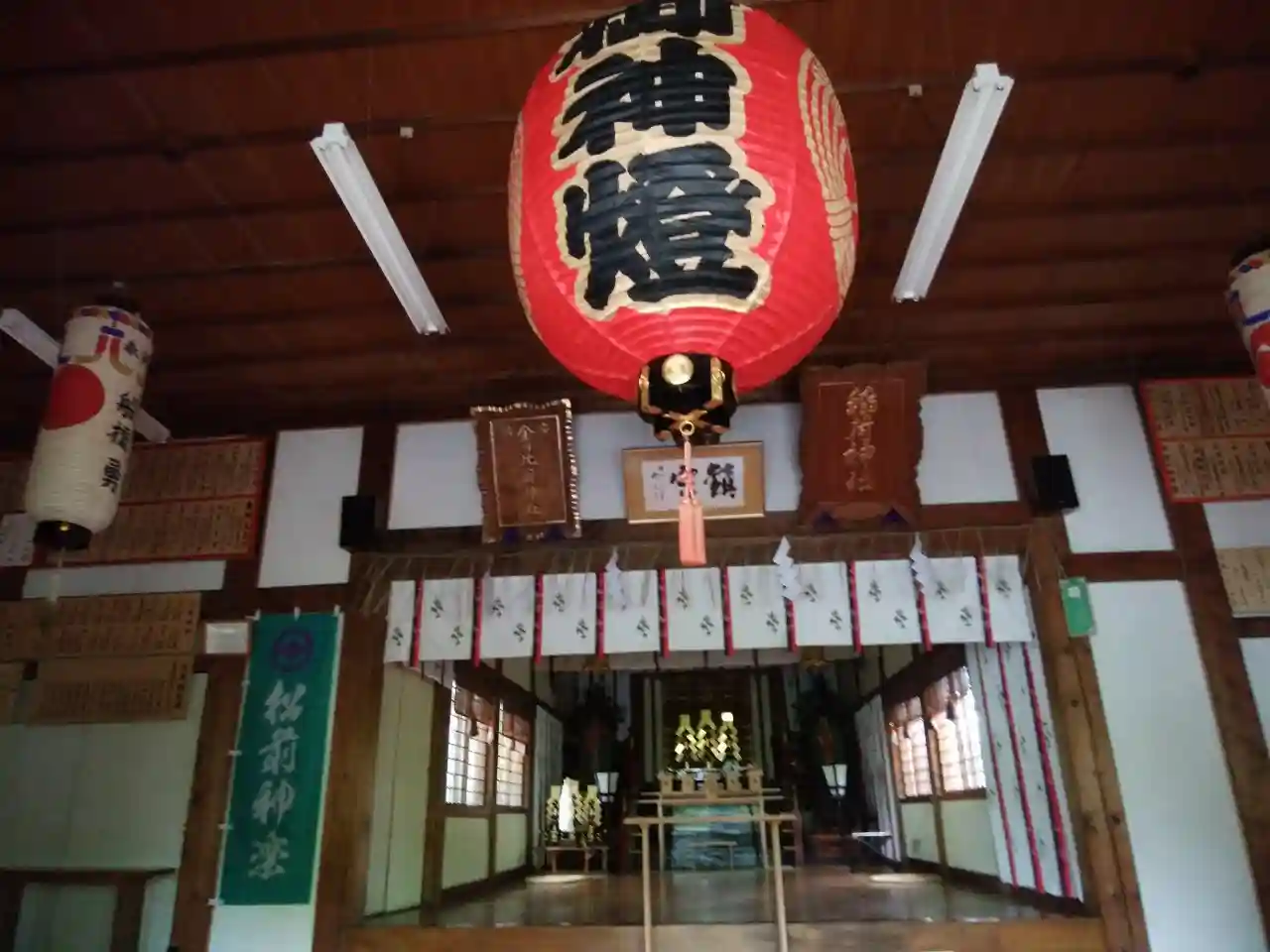 <拝殿>内部。寺院本堂のような大提灯が特徴的。扁額は「稲荷神社」と「金刀比羅神社」の2つある。調べると、「金刀比羅神社」の祭神は大物主命で、合併により合祀されたとのこと。
