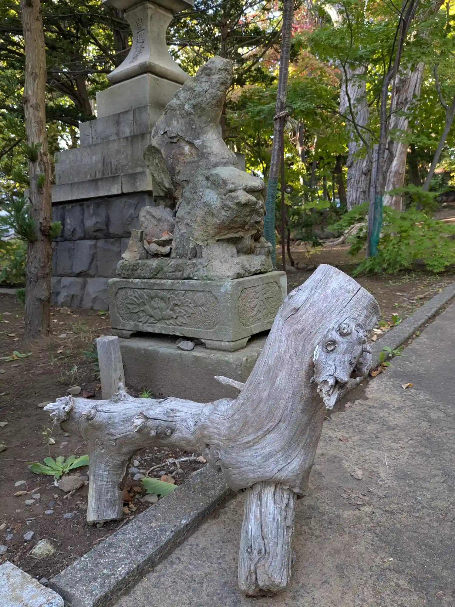鳥居の手前に木のワンちゃん!