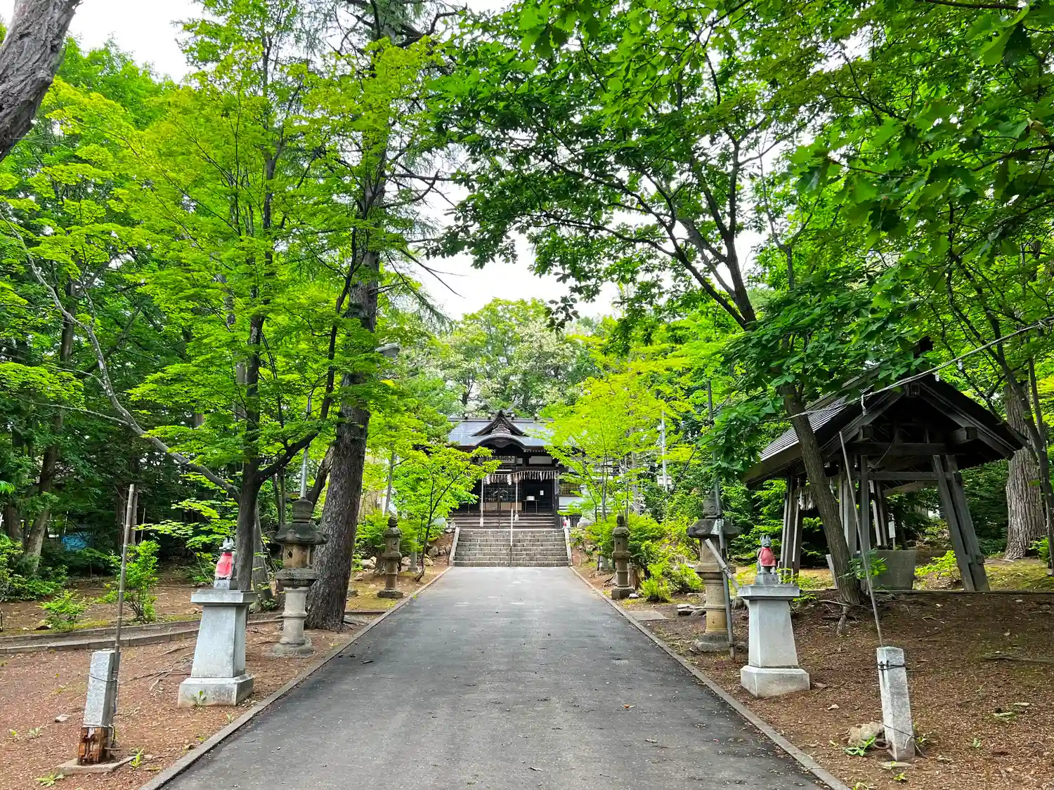 参道を進む。ちょうど新緑がキレイな時期。森林公園内を歩いている感じ。