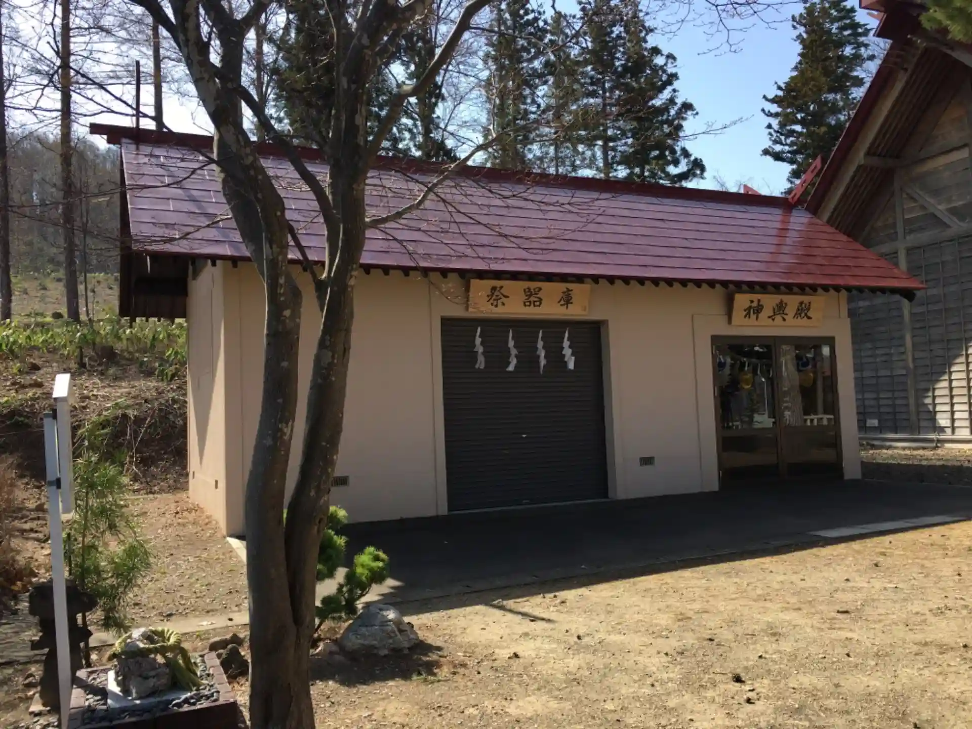 拝殿左手の祭器庫と神輿殿。