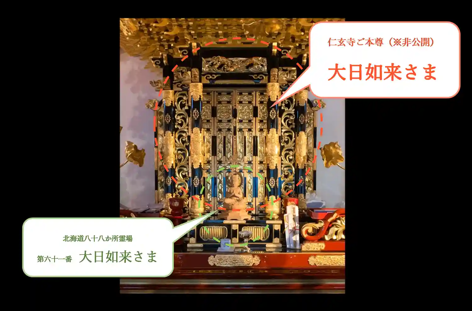 (※ちなみに本尊さんは、厨子の中にいます。手前に見えますのは、北海道八十八か所・61番の大日如来さんです。)