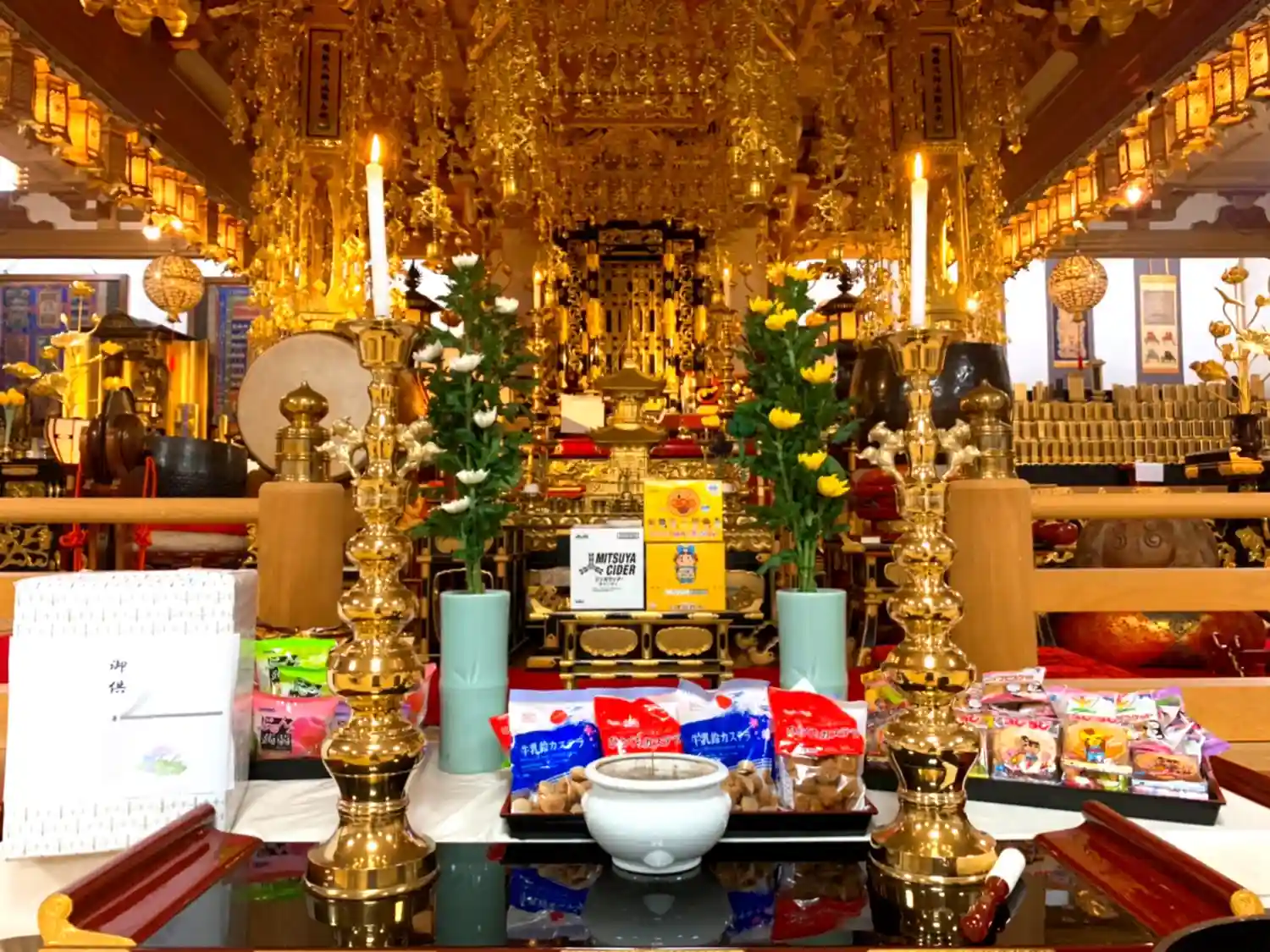 手前の仏器は、どかしてしまった後ですが、真ん中の仏塔【以外】の、壇に載っているものは、すべて仏器です。こんな風に、お寺にはたくさんの磨かれるべき仏器があります。そして、真言宗は他宗さんよりも仏器の数が多い印象です。