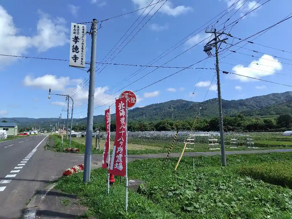 | 北海道八十八ヶ所霊場 第60番 | 仏さま:大日如来 御真言: おん あびらうんけん ばざら だとばん 御詠歌: 鳴く鳥も 参るお寺は 孝徳寺 迷世を灯して ホーホケキョ |