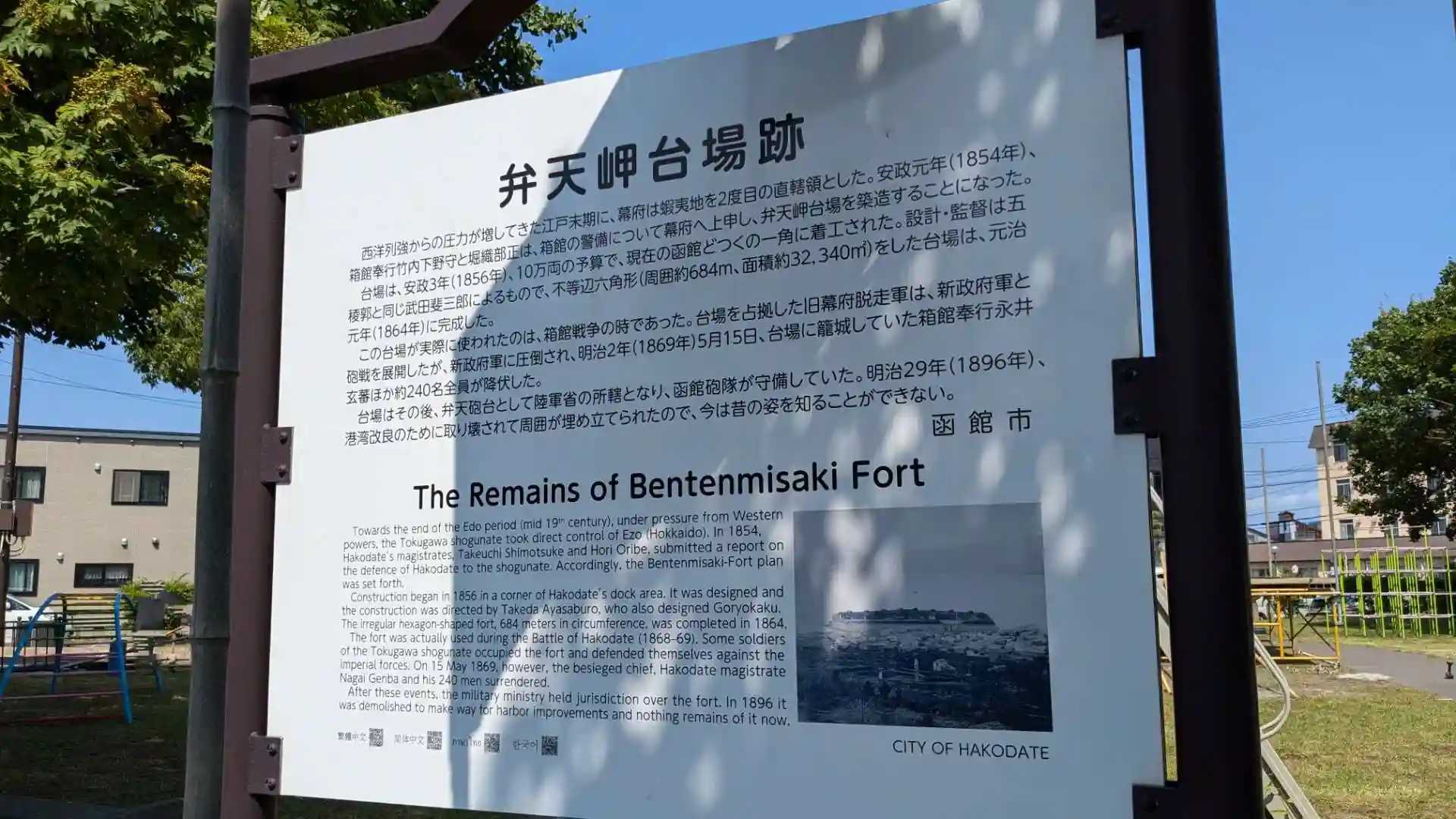 かつてこの場所にあった弁天岬台場は箱館戦争で新選組が最後に戦った場所で隣の入舟児童公園には新選組最後の地の記念碑が建てられています。