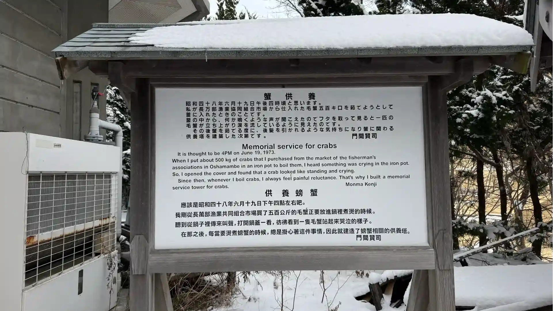 それ以来、蟹を茹でるたびに心が痛み、蟹への感謝と供養の気持ちから、この供養塔を建てたとのこと🦀