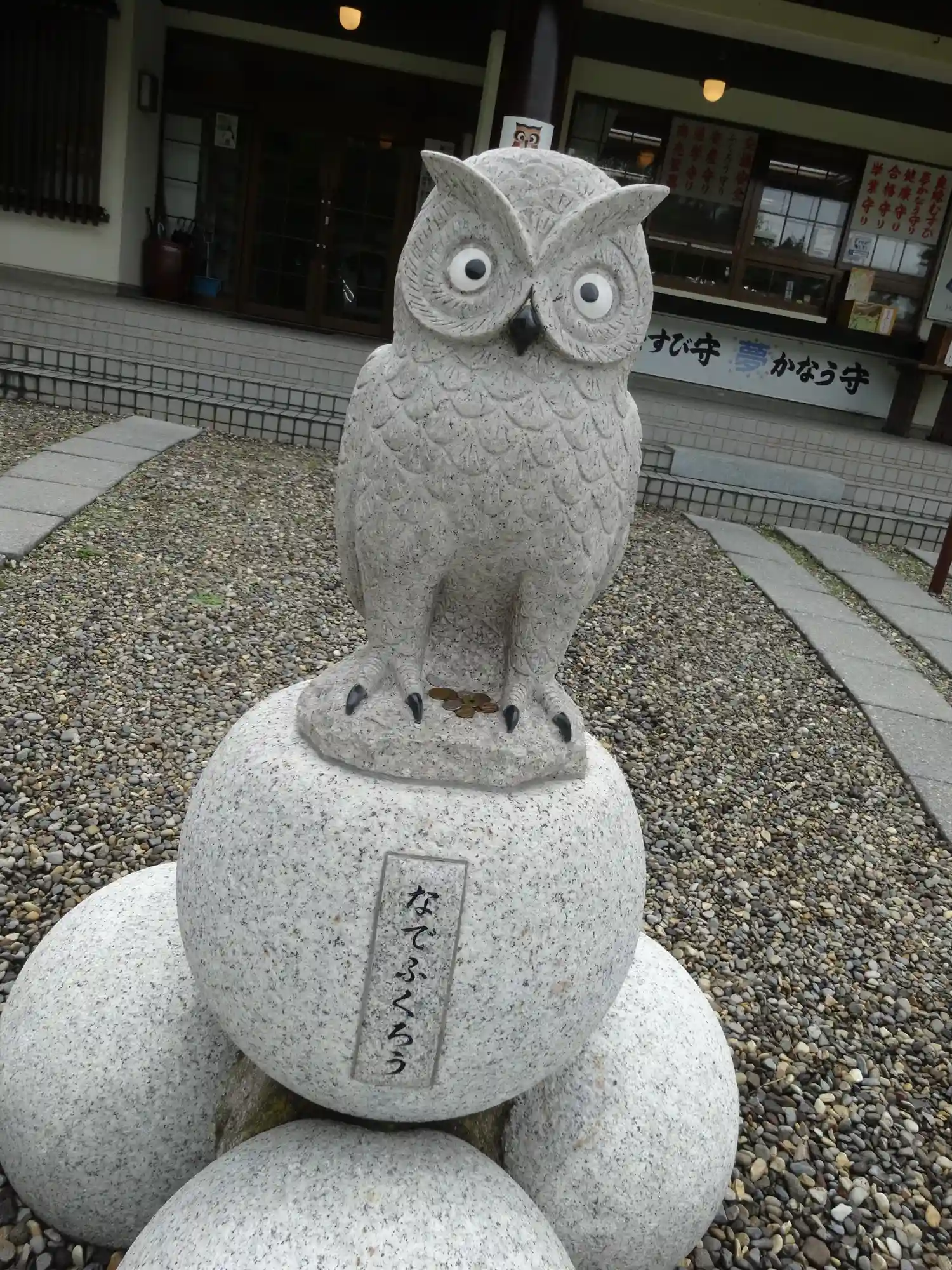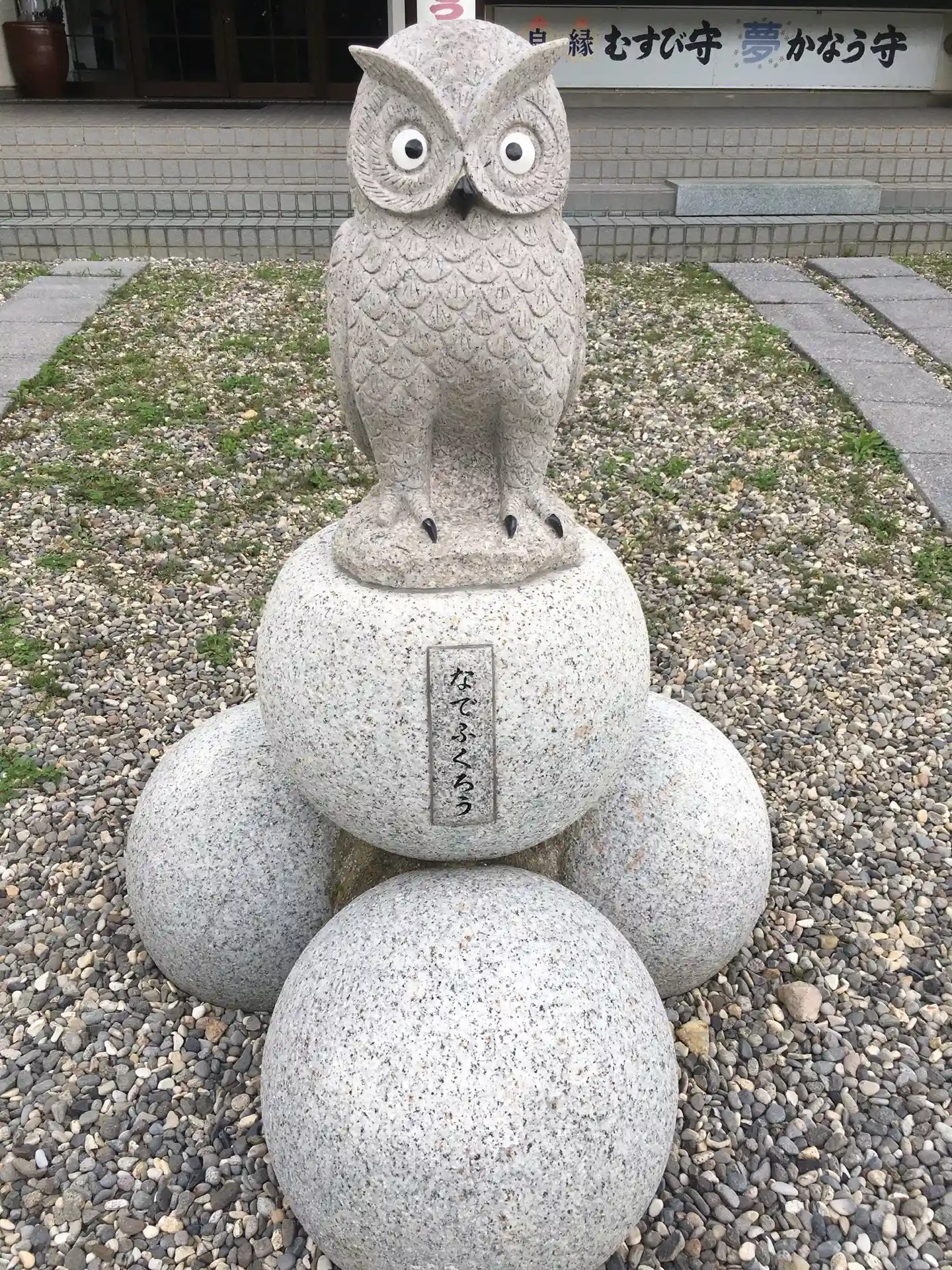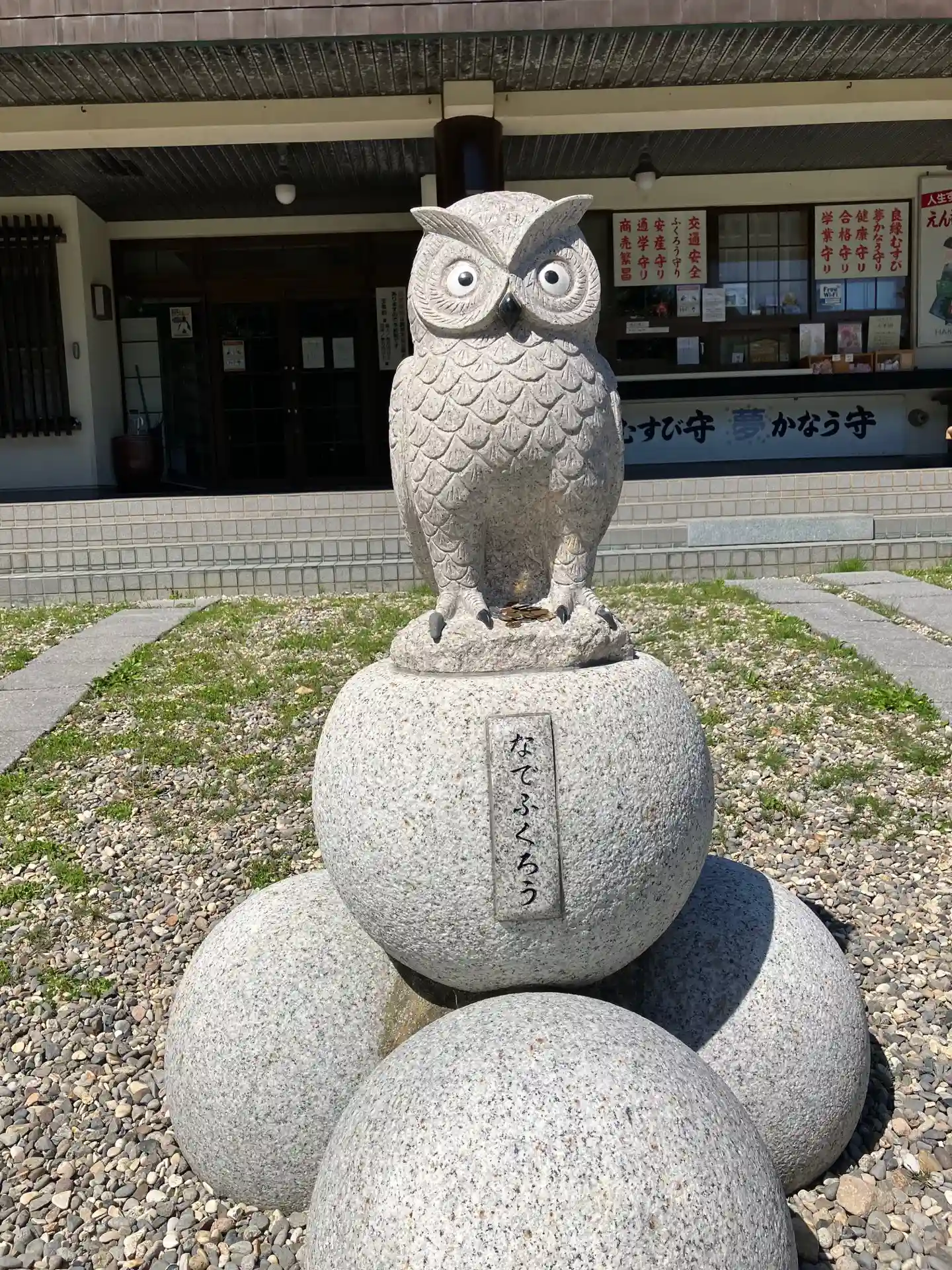 社務所前には人気の撫でフクロウさん。