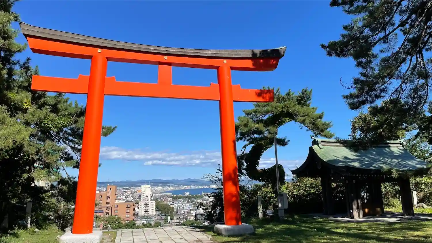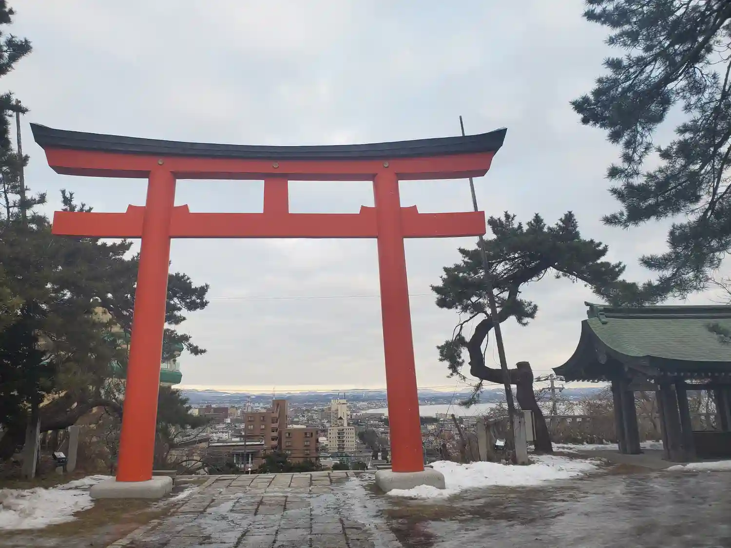 鳥居の先から函館の町並みが見えます