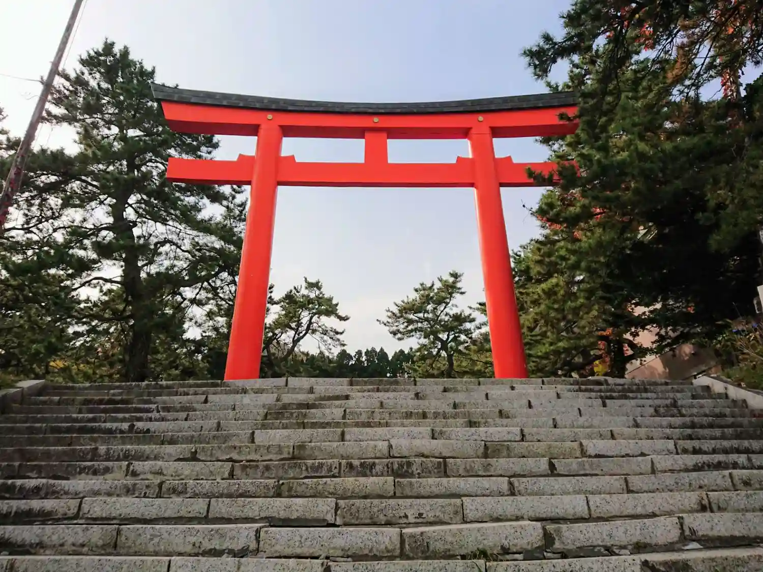 立派な赤の鳥居⛩️と青空の青が美しい1枚です。