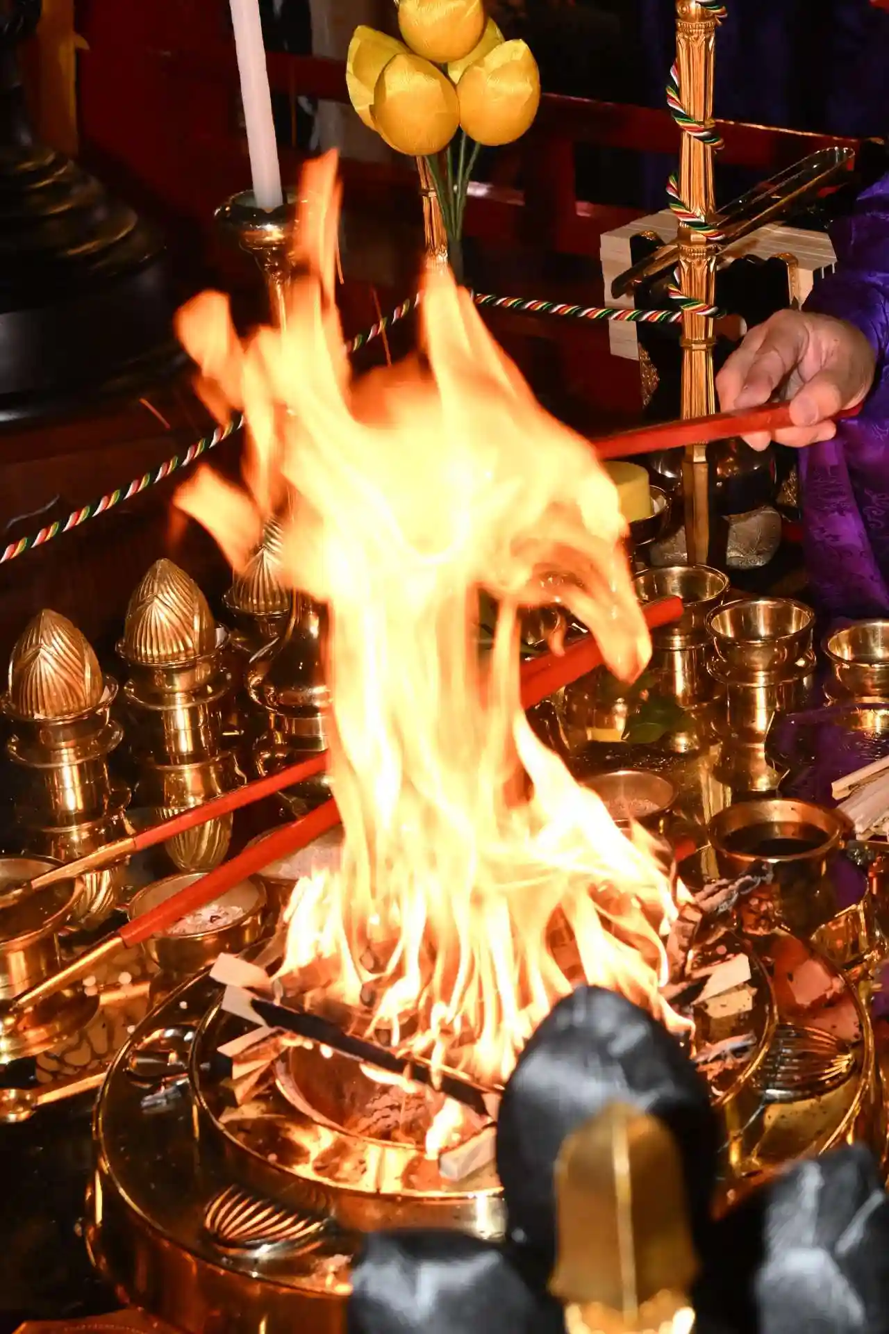 お導師により皆様が記入した薪を炉壇に組み上げて、お不動様の智慧の炎で焼き尽くし、お願い事を祈願します。