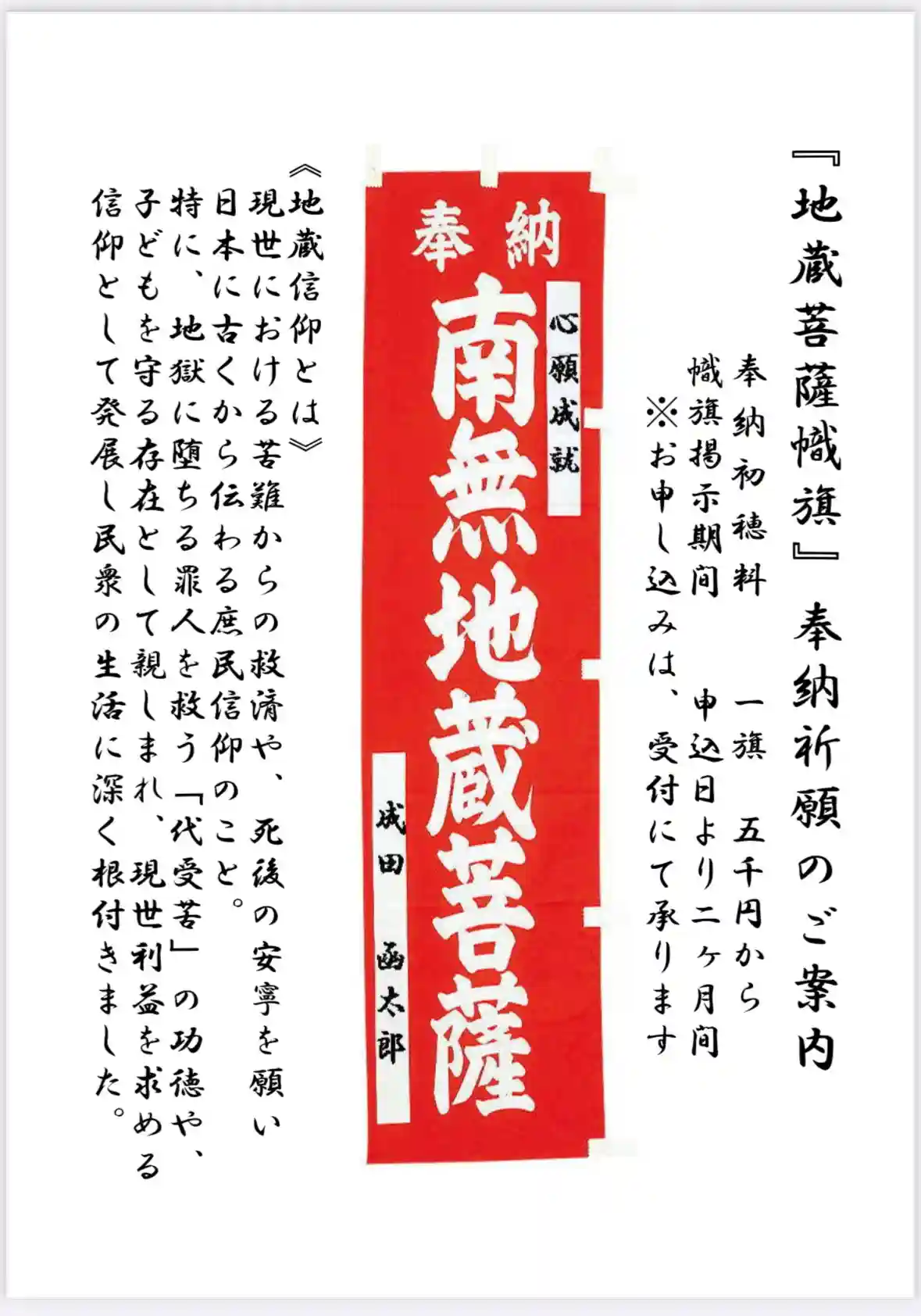成田山函館別院では、地蔵堂前に掲げる幟旗にお願い事とお名前を書き入れ、お地蔵様のご利益をいただける…