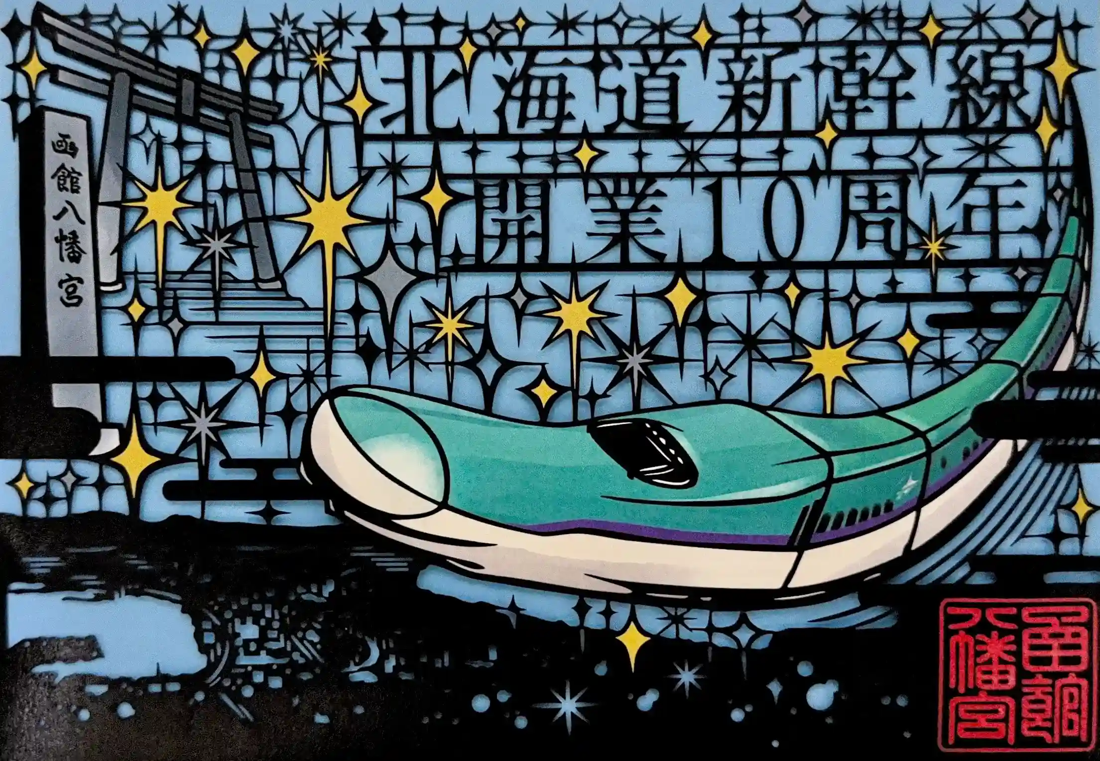 北海道新幹線H5系と函館山からの夜景、神社の社号標、本殿へと続く階段、鳥居が繊細な切り絵で表現