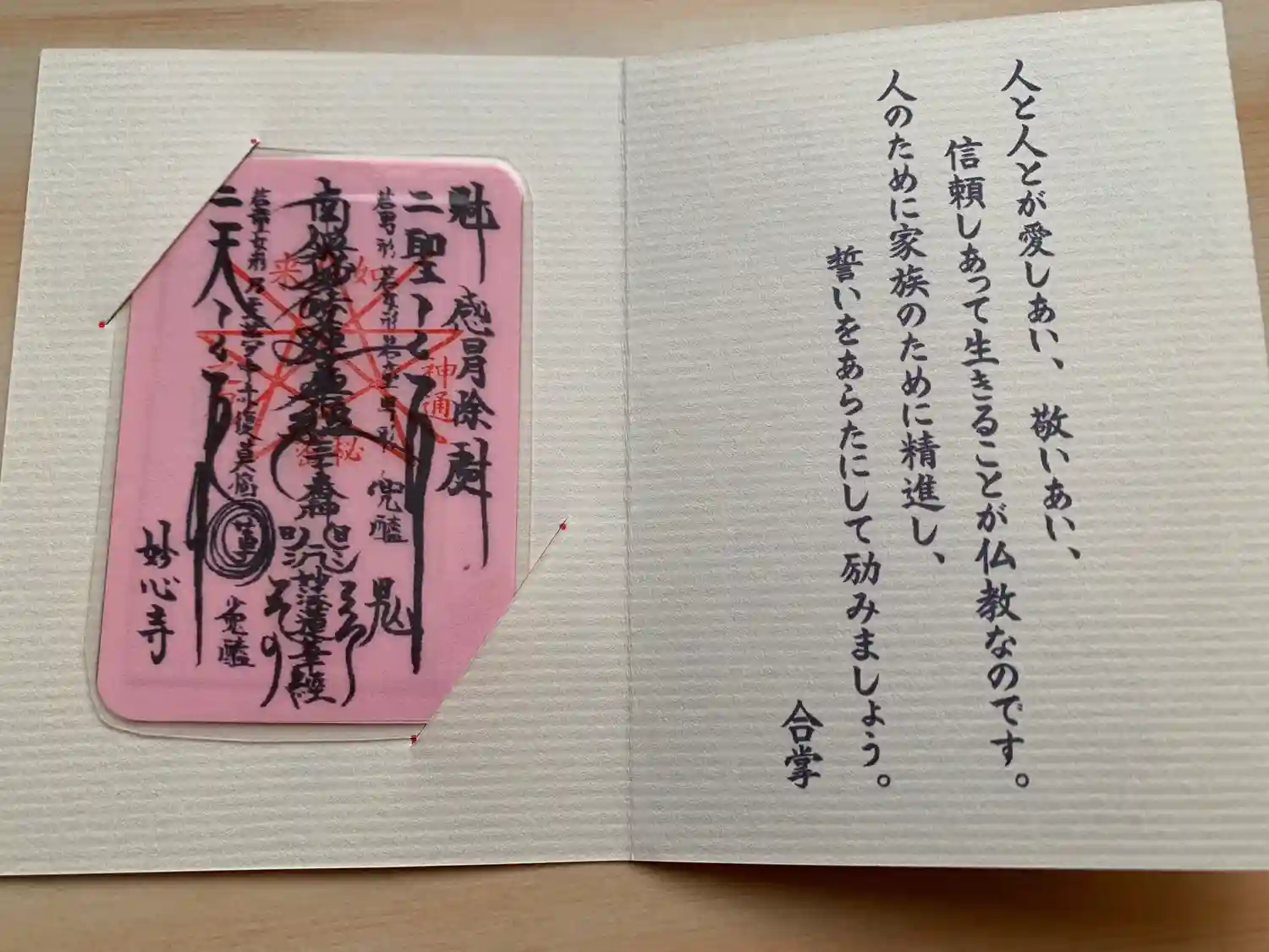 カード型の御守りになっています。台紙の言葉も身に沁みます…