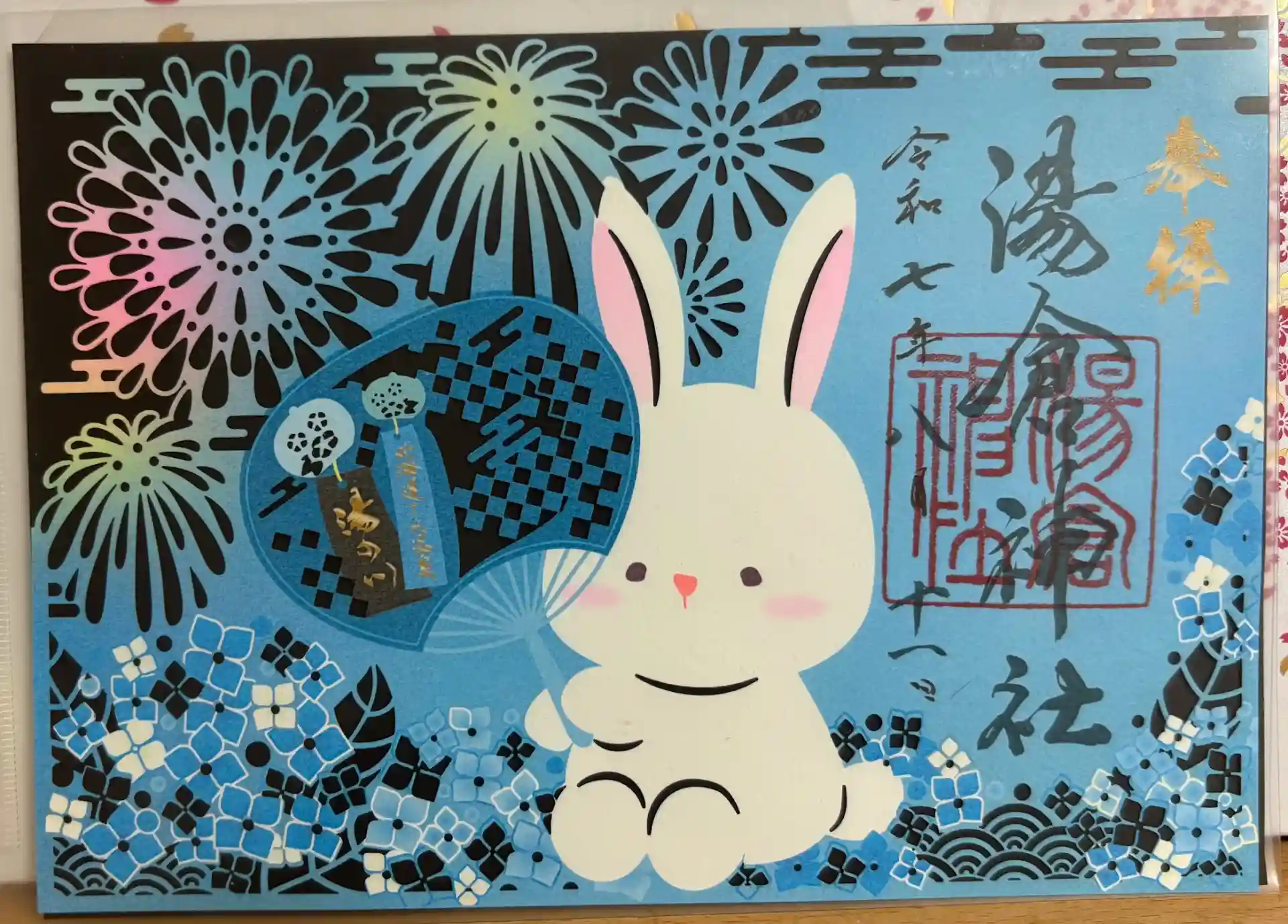 撫で兎が団扇持ってます。