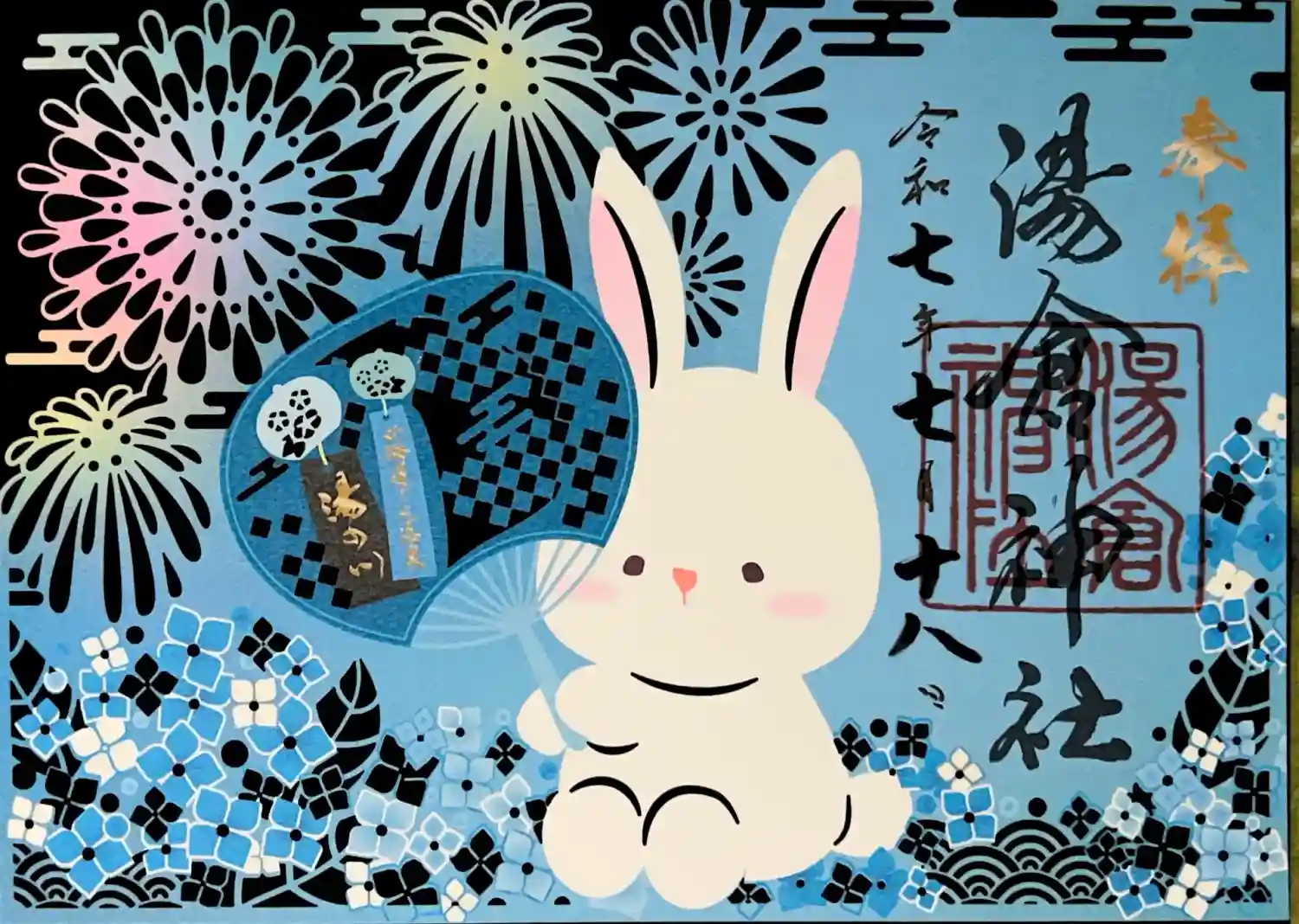 撫で兎が団扇持ってます。