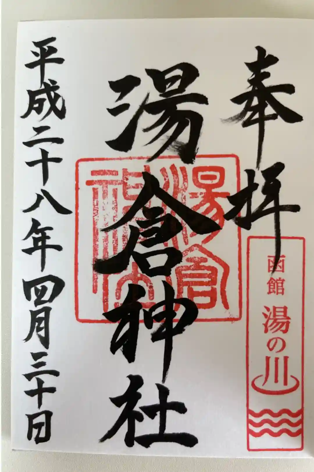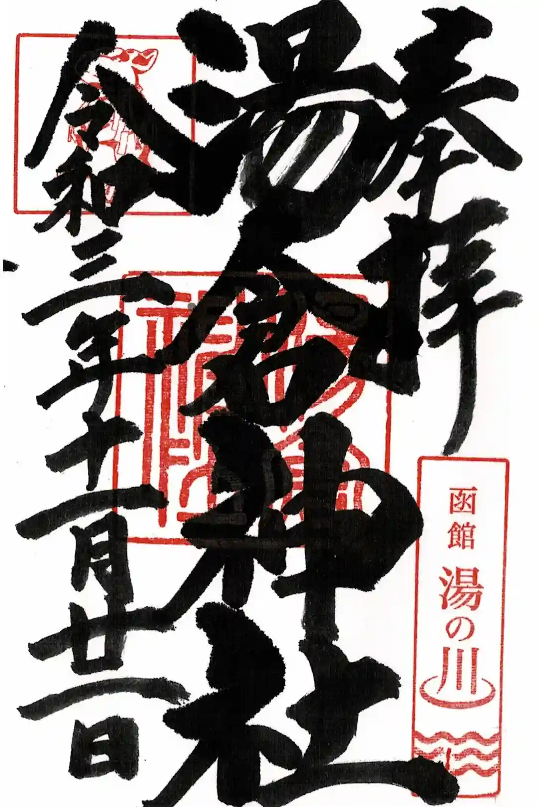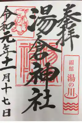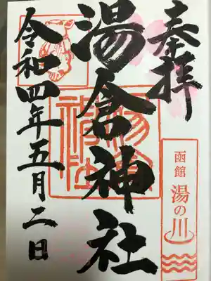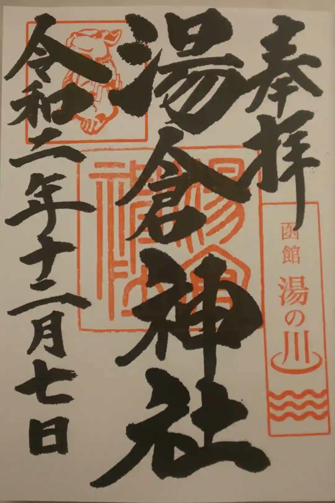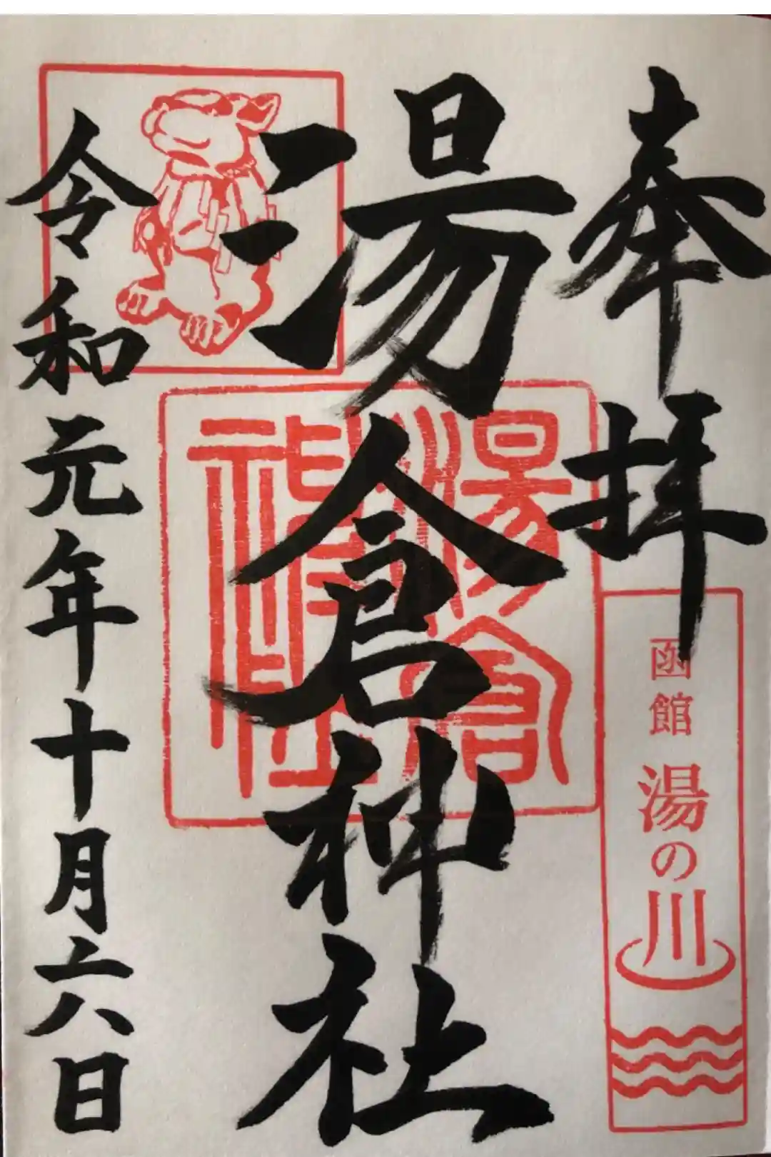 ・湯の川温泉と神兎(なでうさぎ)のお印が印象的な御朱印です。